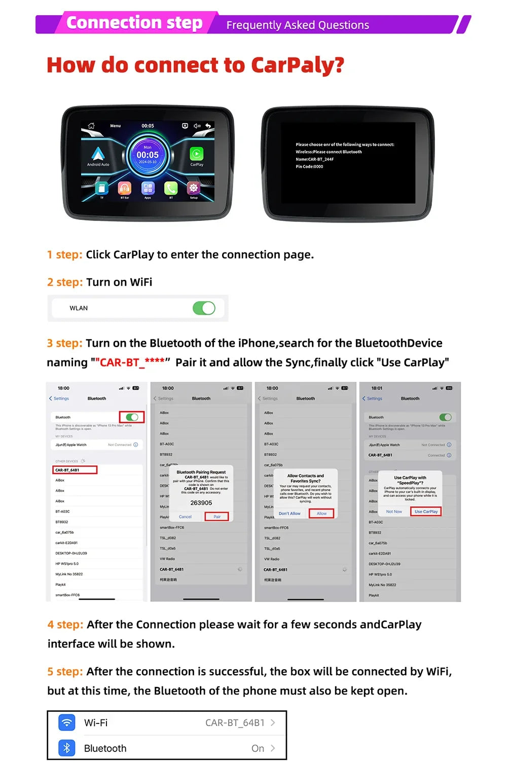 Utilisation et instructions : Installez l’appareil sur votre tableau de bord grâce au support dédié. Connectez-le facilement à votre smartphone en suivant les instructions de mise en relation pour CarPlay ou Android Auto via Bluetooth et WiFi. Assurez-vous que la source d’alimentation de 12 V est stable pour garantir un fonctionnement optimal et profiter pleinement de ses fonctionnalités.