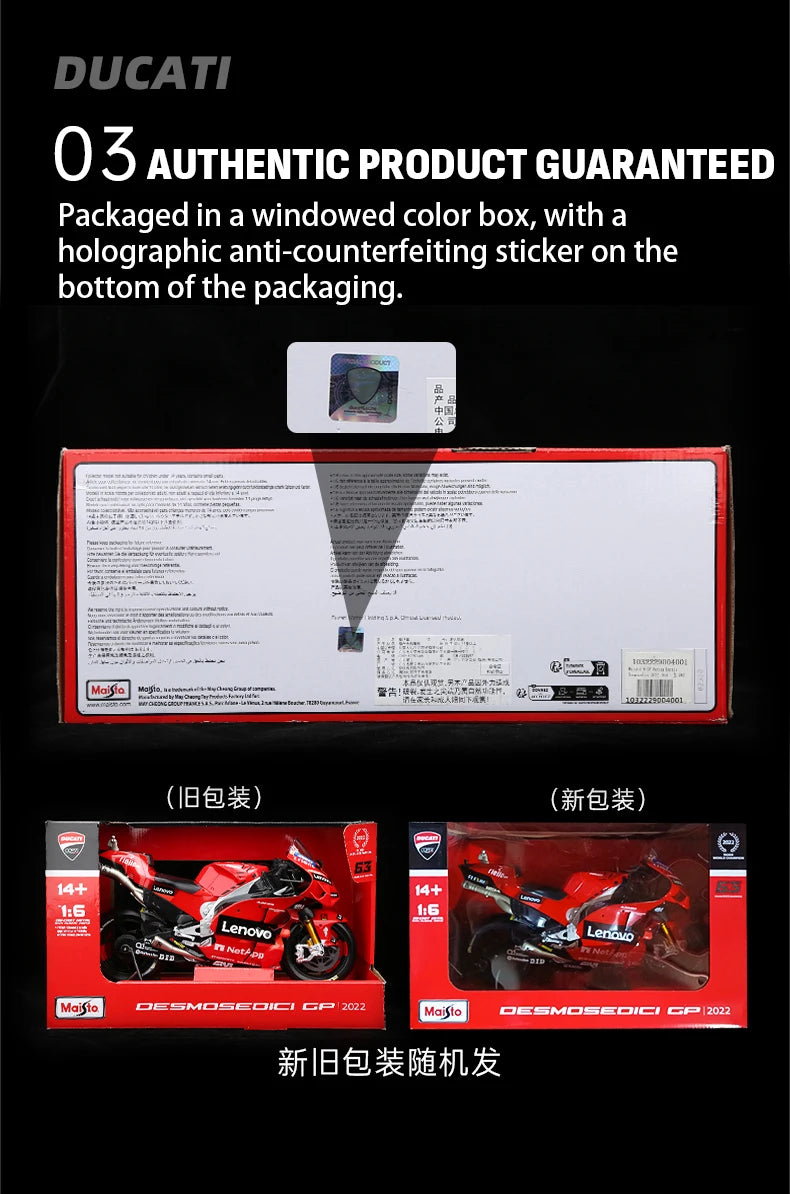 Produit par Maisto, référence mondiale dans le domaine des modèles réduits, ce modèle bénéficie de la seule licence authentique des équipes de course Ducati Racing. La précision de sa conception et la qualité de ses finitions en font un véritable objet de collection.