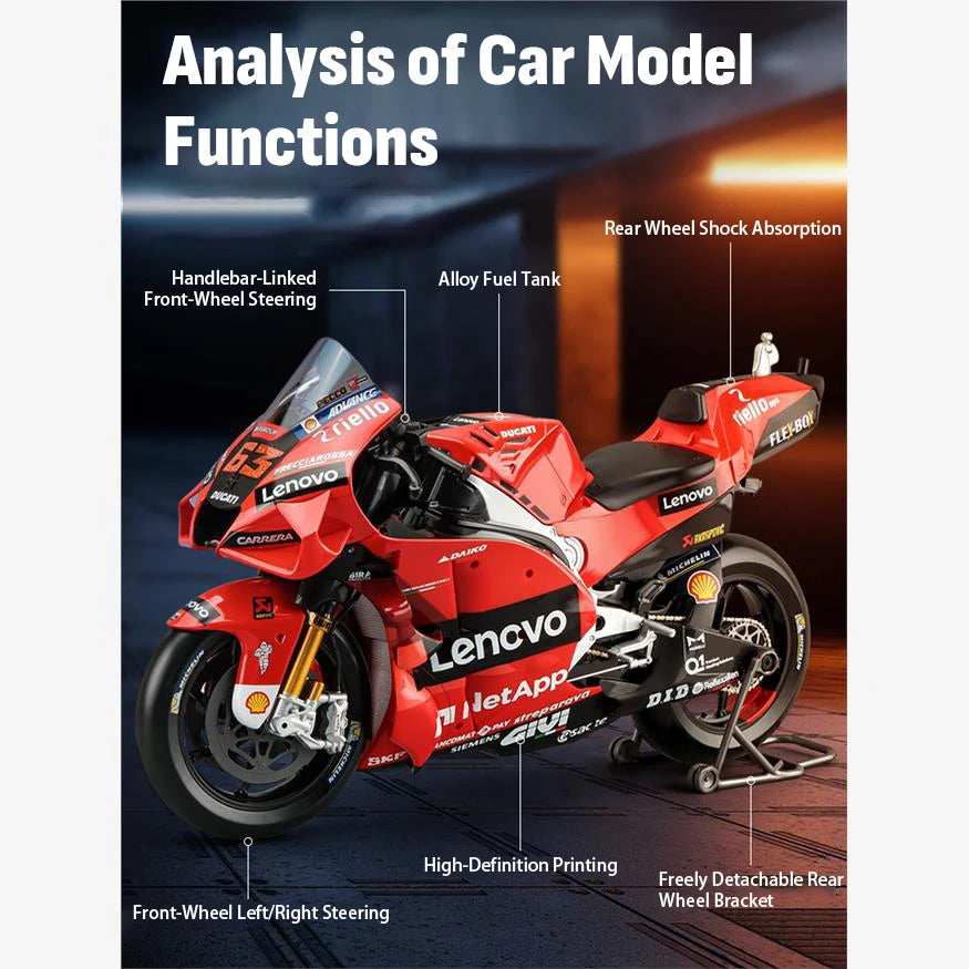 Ce modèle se distingue par ses finitions de haute précision et son design inspiré des prototypes de course, offrant ainsi une représentation fidèle et élégante de l’esprit Ducati Racing Team.