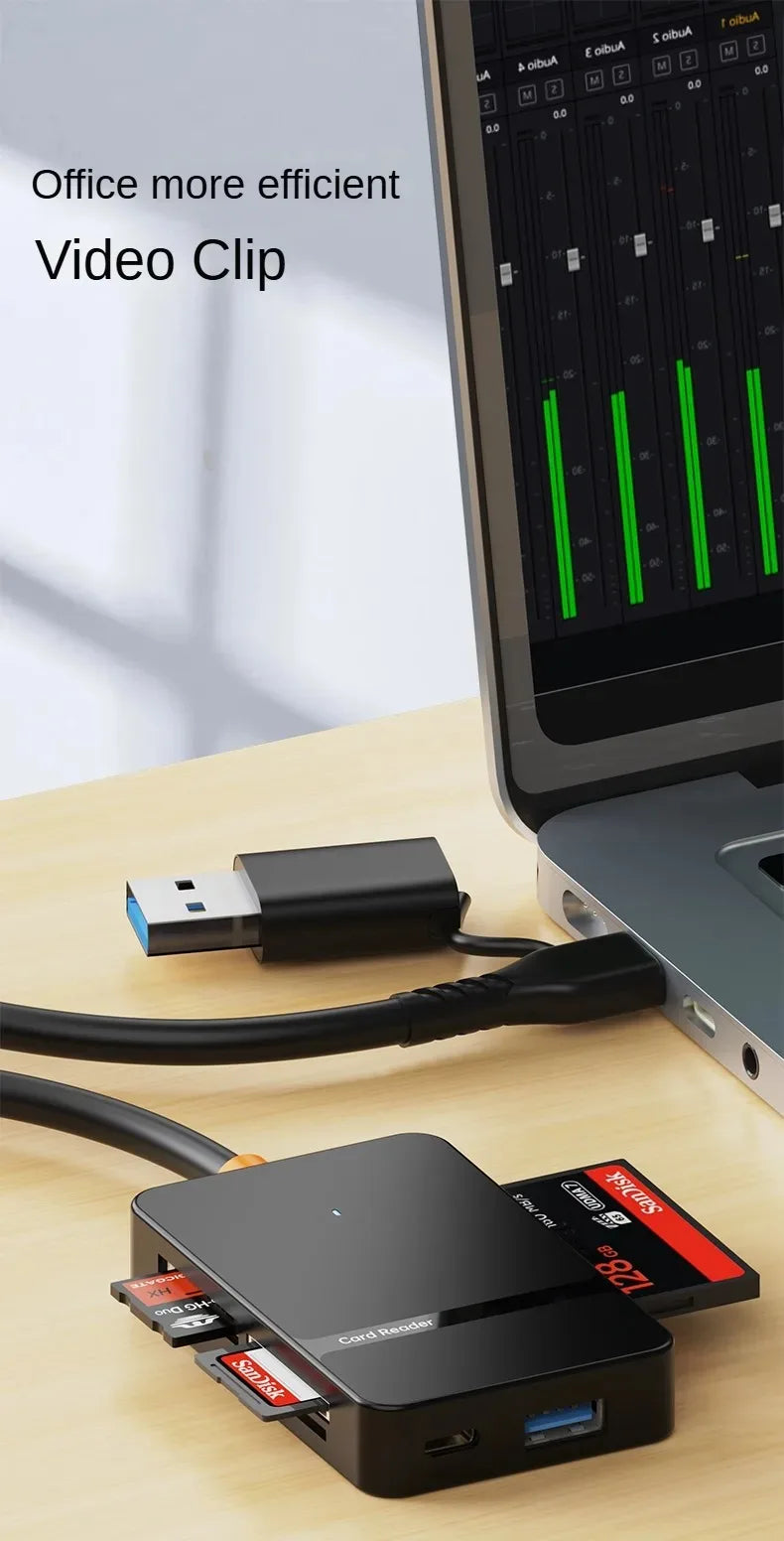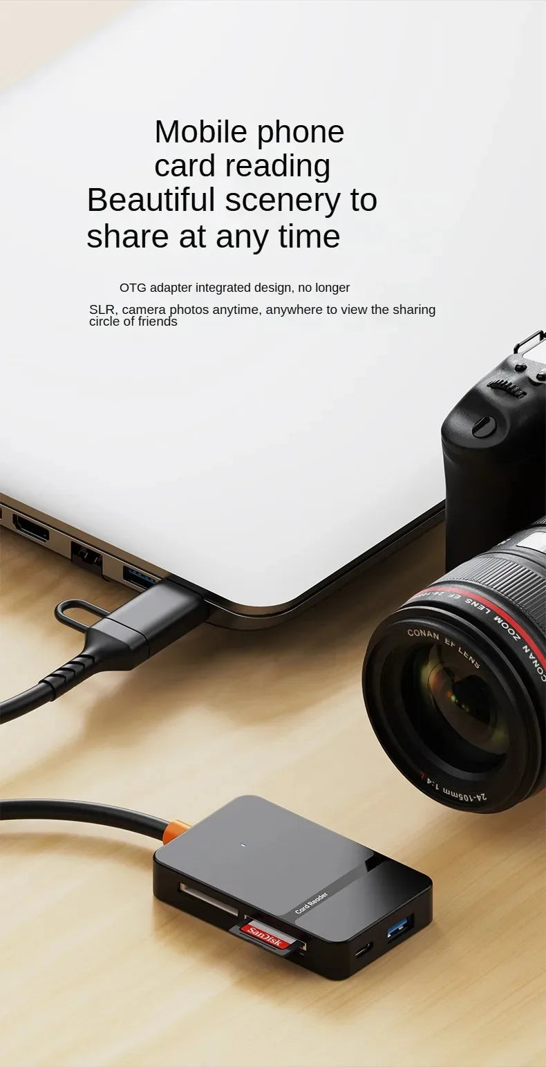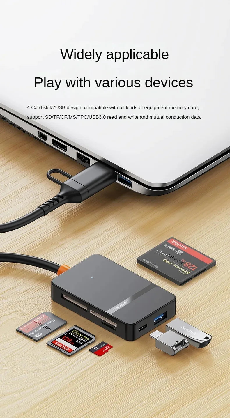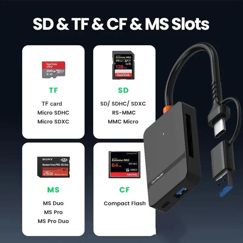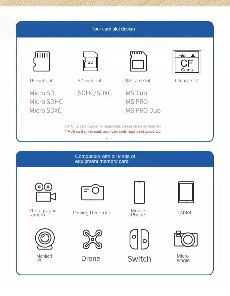 • Spécifications de connexion : Prend en charge une large gamme de cartes – SD, Micro SD, TF, CF, MS, MMC – et intègre également une clé USB externe