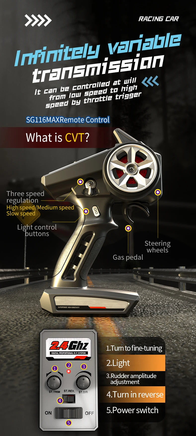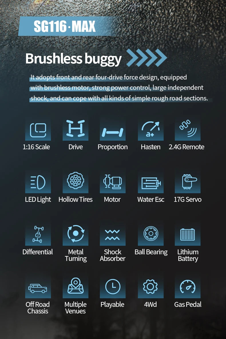 - SG116PRO avec moteur à balais en carbone (vitesse maximale jusqu’à 40 km/h)