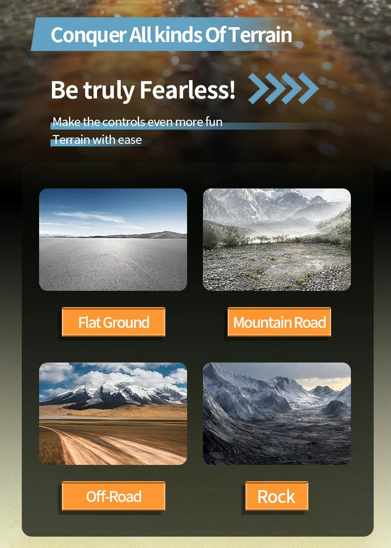 • Système de suspension et roues motrices 4WD offrant une stabilité et une adhérence exceptionnelles sur terrains plats, sablonneux ou boueux