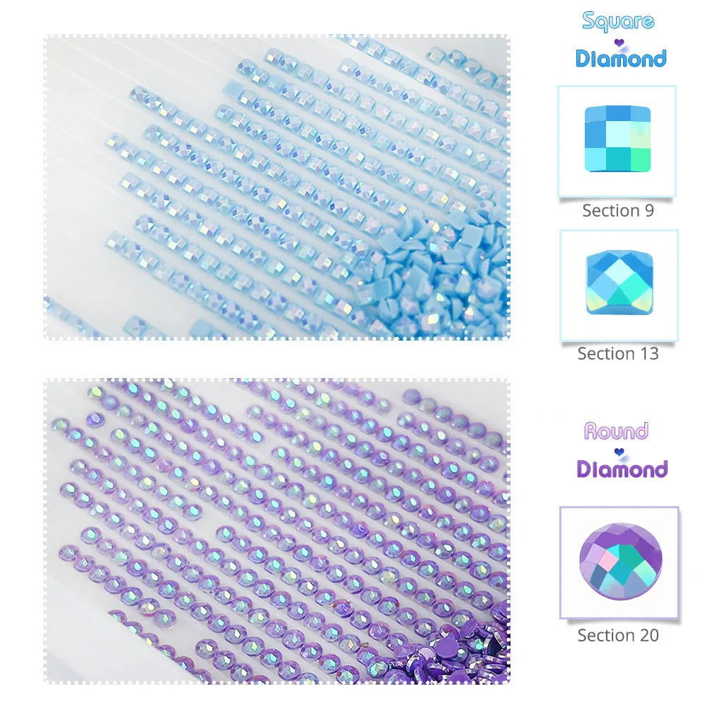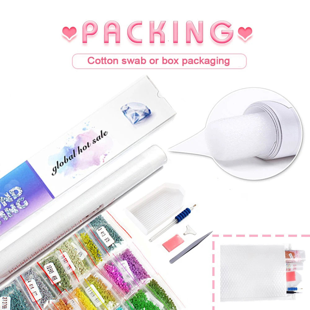 • Accessoires inclus : Outils spécifiques, quantité suffisante de diamants (remplacement gratuit en cas de manquant) et toile imprimée en haute résolution, soigneusement emballé dans une boîte colorée et une toile enroulée