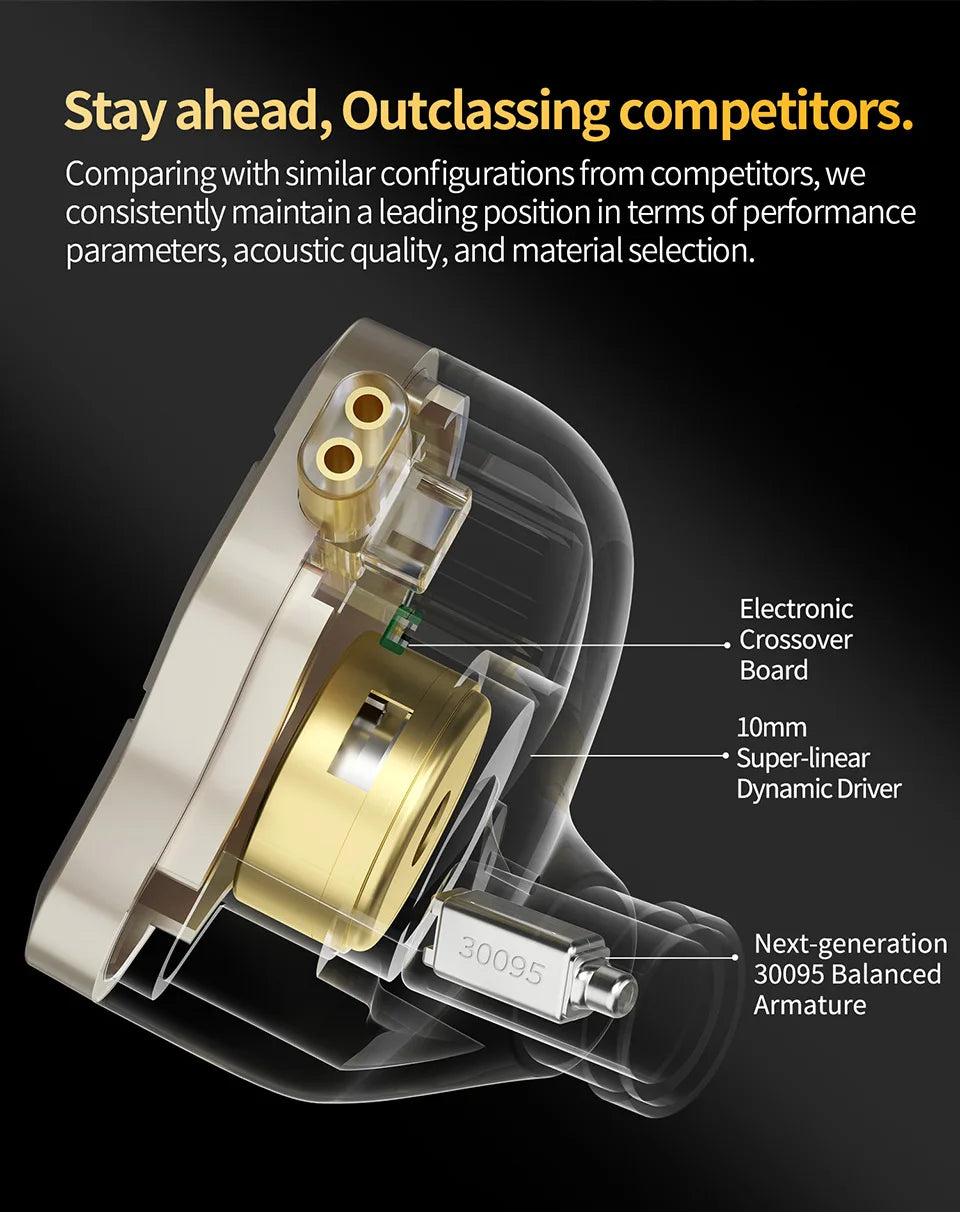 • Technologie hybride : Combinaison de 1BA + 1DD pilote assurant une restitution sonore précise et équilibrée.