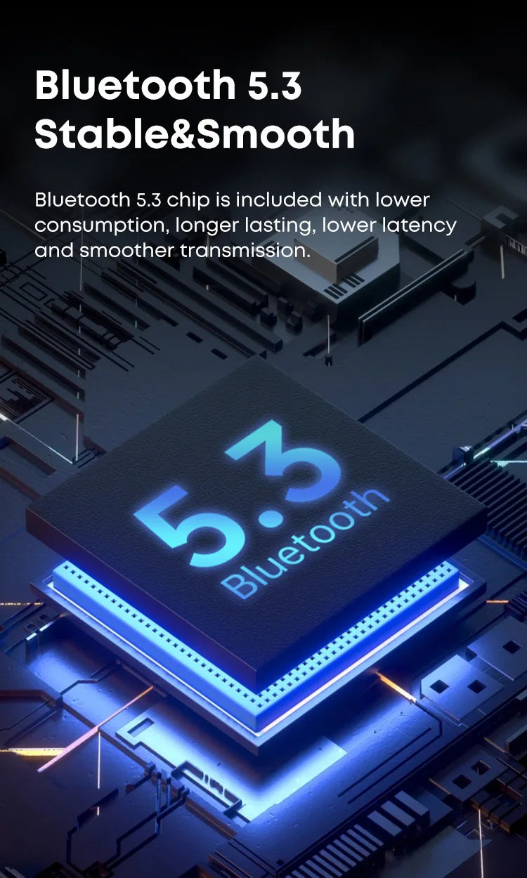 • Technologie : Bluetooth 5.3 offrant une connexion stable sur une portée de 10 mètres, avec prise en charge des codecs AAC.