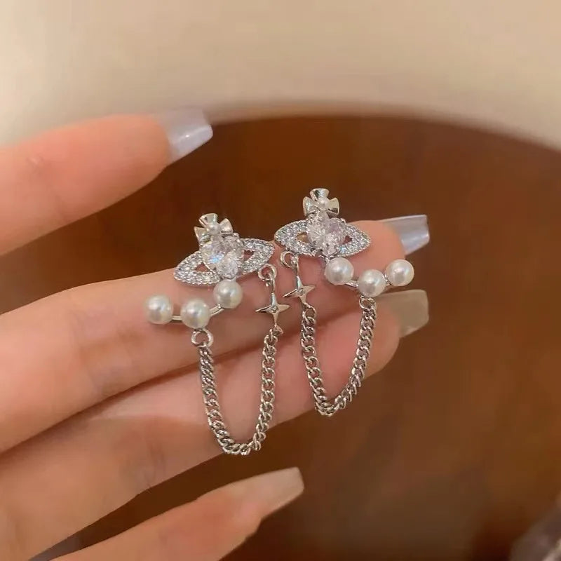 Les boucles d'oreilles pendantes avec perles et croix marient luxe et élégance pour sublimer votre style. Parfaites pour les soirées et événements spéciaux, ces bijoux uniques arborent des motifs de cœur, étoile et Saturne pour un look sophistiqué et audacieux. Conçues pour les femmes recherchant un accessoire chic et original, ces boucles d'oreilles combinent harmonieusement perles classiques et chaînes modernes pour un effet intemporel.