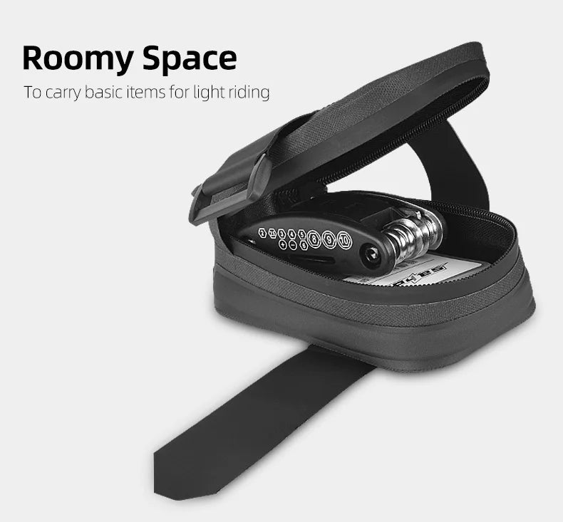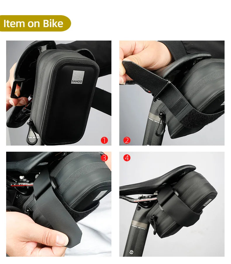 Il vous suffit de positionner le sac sur le tube du siège ou directement sur la selle et d’enclencher les sangles Hook/Loop pour une fixation sécurisée. Le couvercle intégré protège efficacement le contenu, tandis que la forme intelligente maintient le sac debout même lorsqu’il est vide, facilitant ainsi l’accès à vos effets personnels.