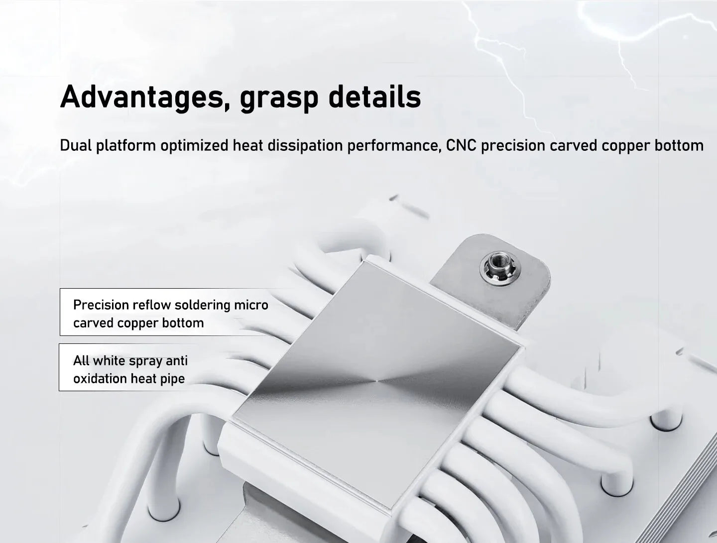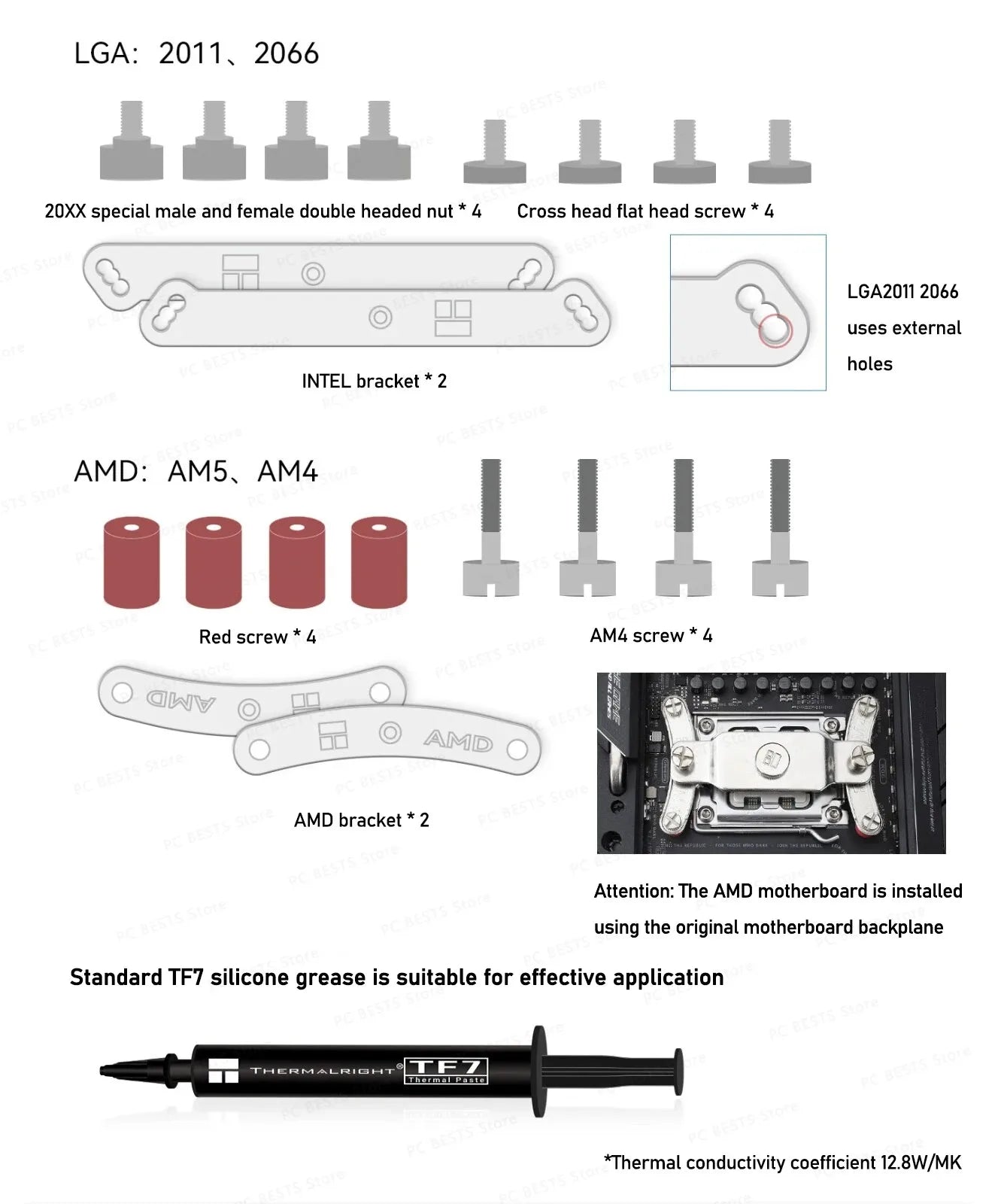 Installez facilement le refroidisseur en fixant le support compatible avec les sockets indiqués. Connectez le ventilateur à l’interface 4 broches PWM pour garantir un contrôle optimal de sa vitesse. Ce système de montage a été pensé pour simplifier l’installation et assurer un contact parfait avec le processeur, optimisant ainsi la dissipation thermique.