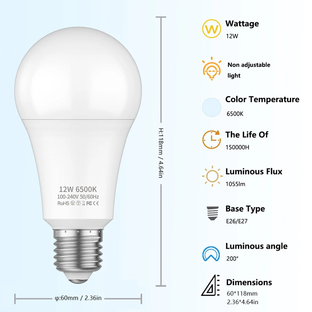 Ampoule LED A19 12W Blanc 6500K E27 E26