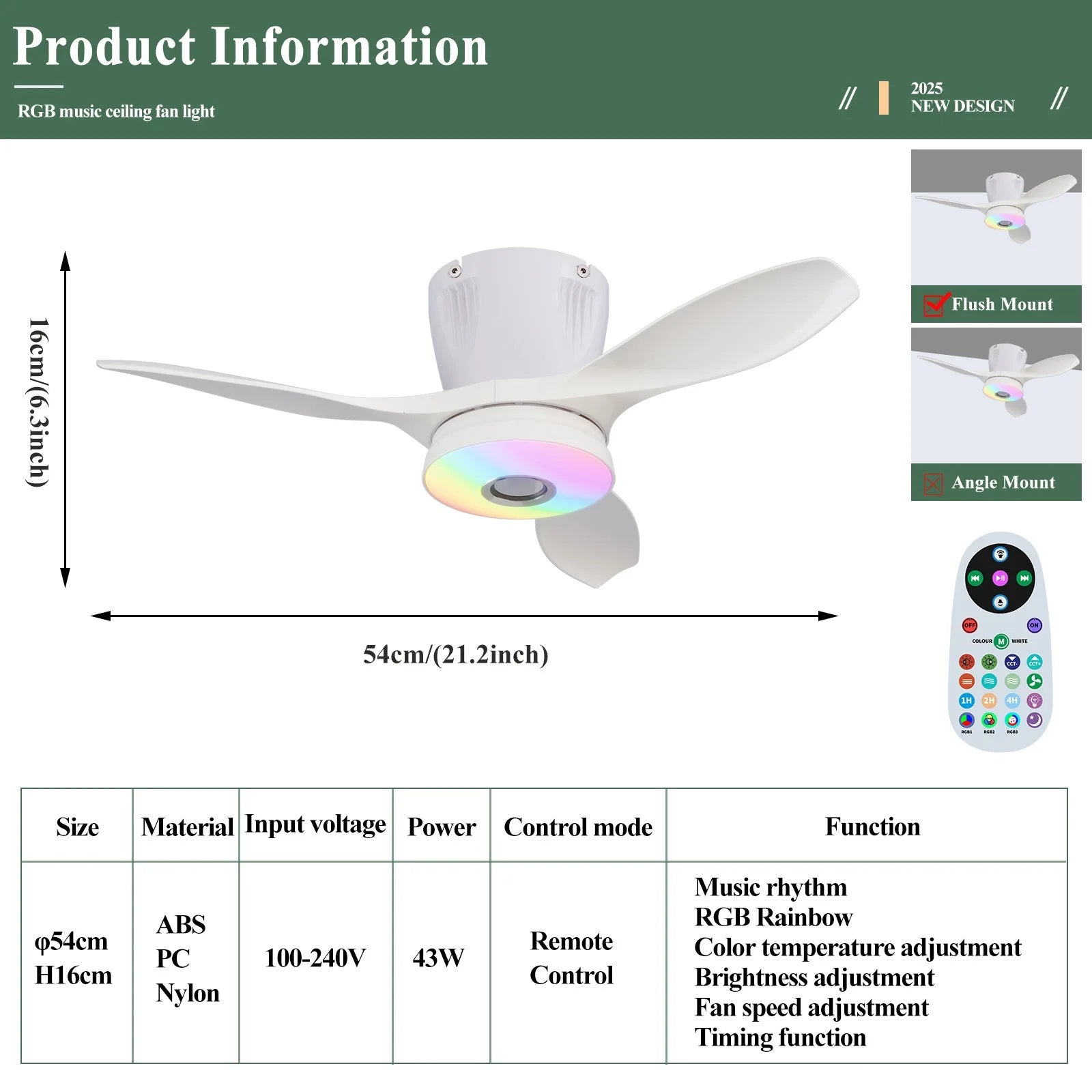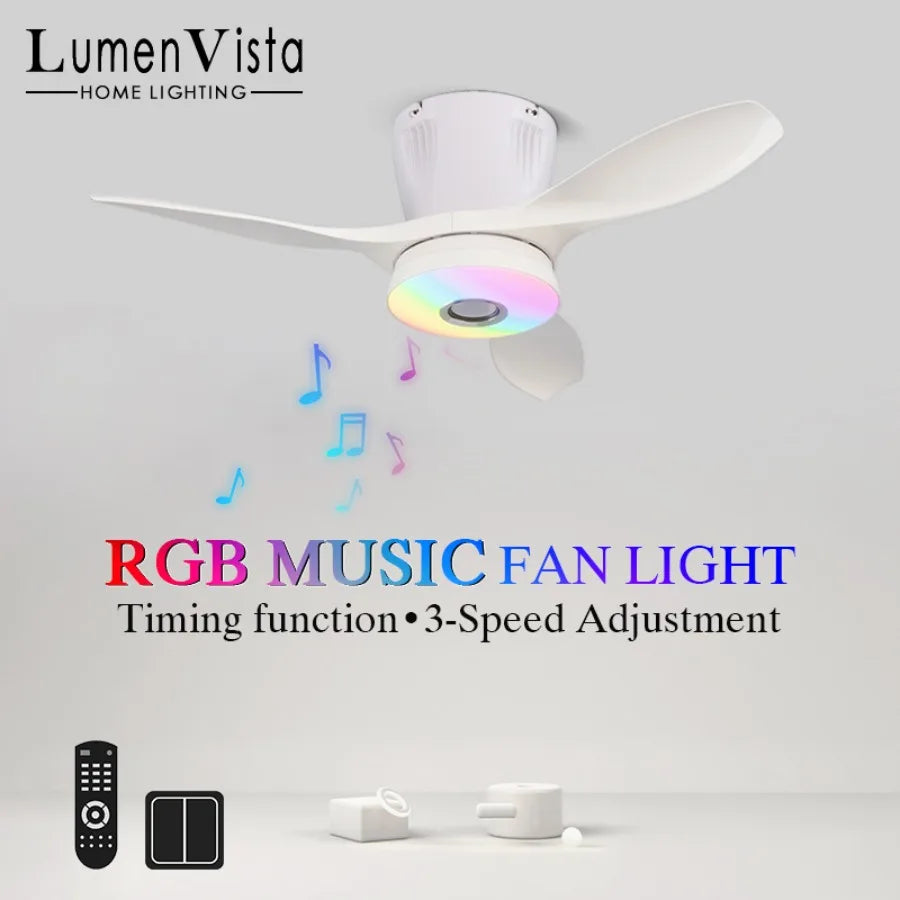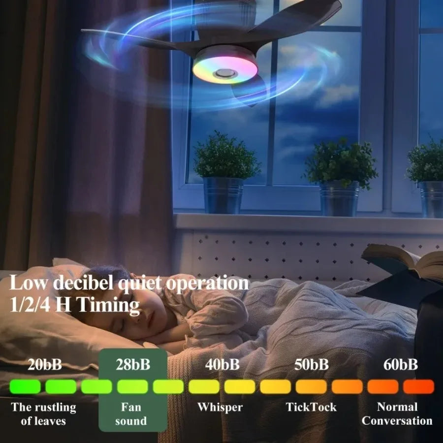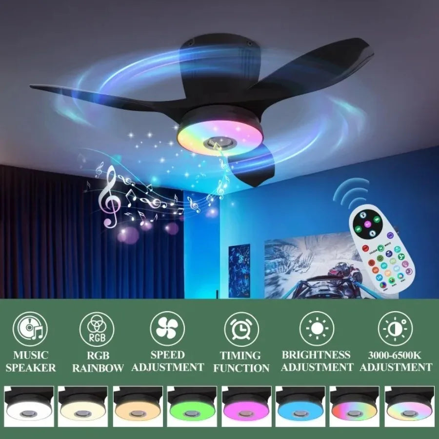 Découvrez le ventilateur de plafond LumenVista, une alliance parfaite entre design moderne et technologies innovantes. Conçu pour transformer votre intérieur, il offre un éclairage LED RGB dynamique synchronisé avec la musique et une ventilation performante pour créer une ambiance unique et chaleureuse dans votre salon ou votre chambre.