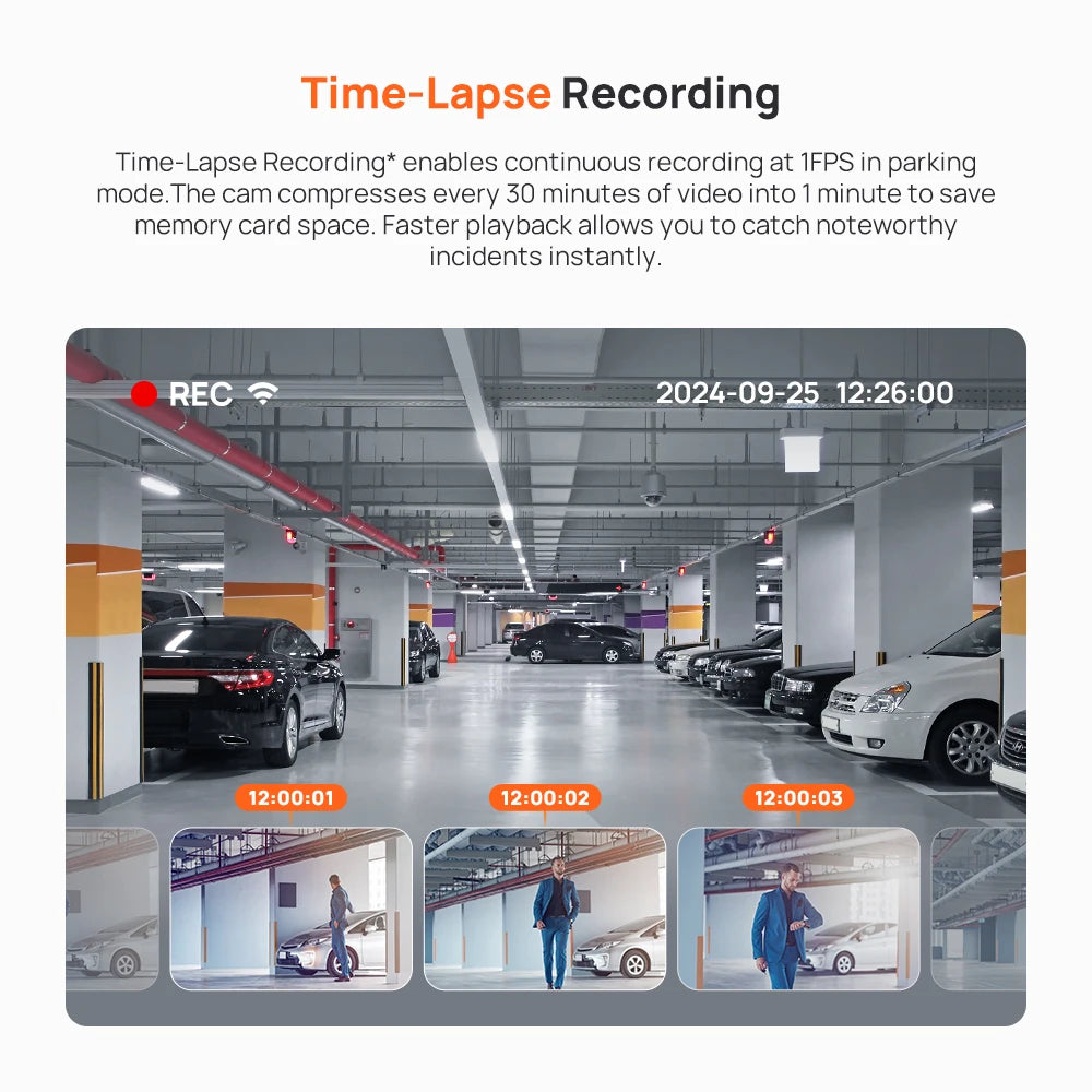 • Enregistrement Time-Lapse en mode stationnement pour compresser l’activité en vidéos condensées