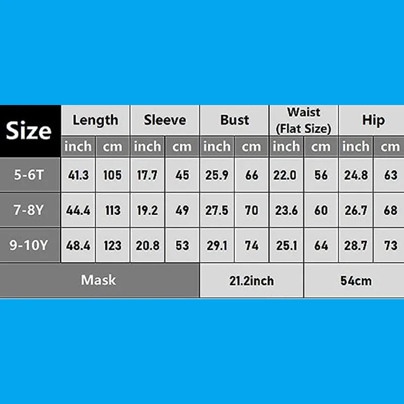 Pour une utilisation optimale, choisissez la taille correspondante en consultant le tableau des dimensions précis. Ce costume, pensé pour s’adapter parfaitement aux morphologies des enfants, garantit un ajustement confortable et sécurisé tout au long de la fête.