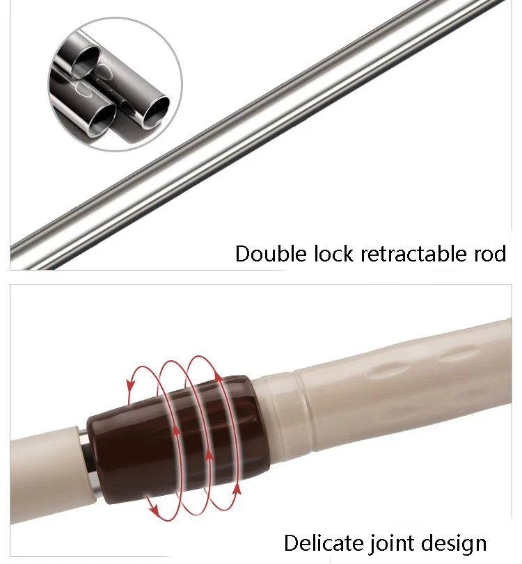 • Poignée télescopique en acier inoxydable associée à une tige en aluminium, offrant un ajustement personnalisé pour éviter toute flexion inutile.