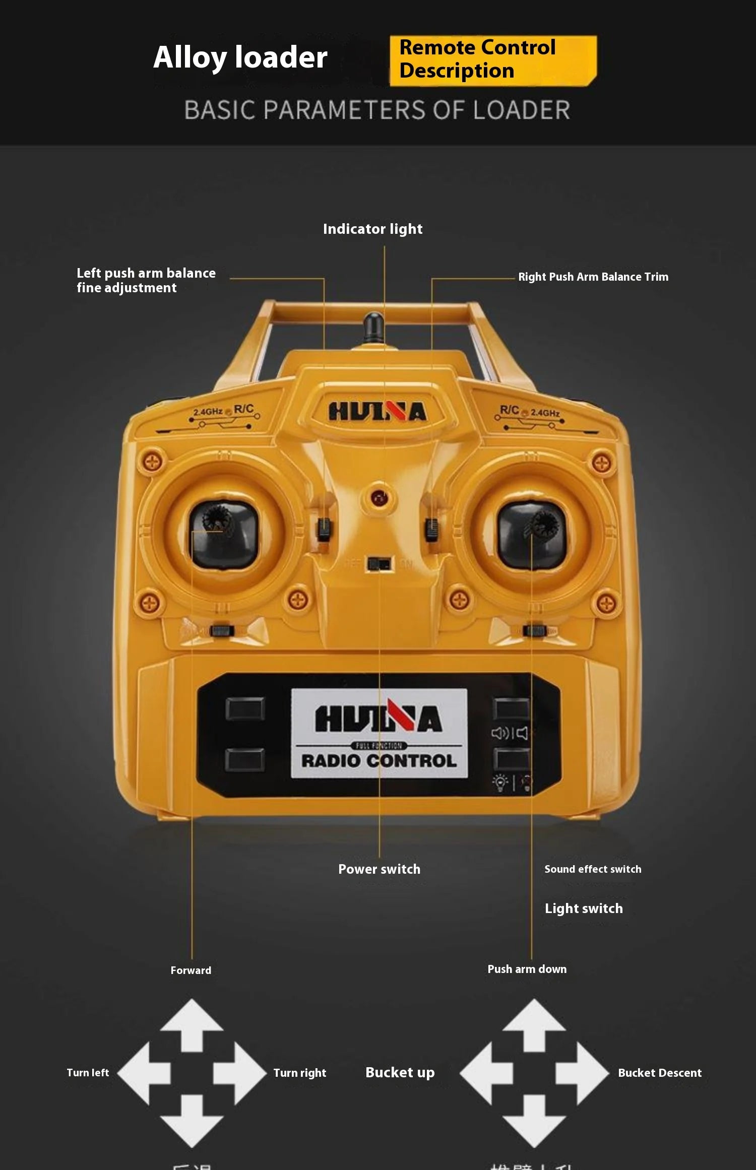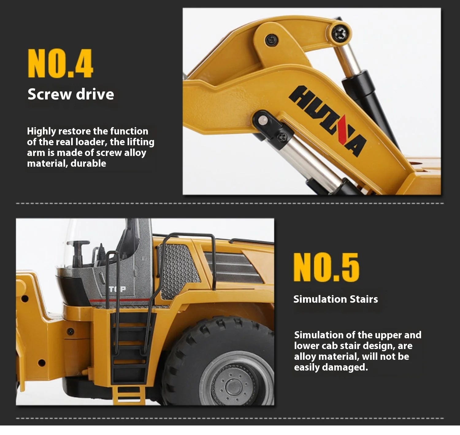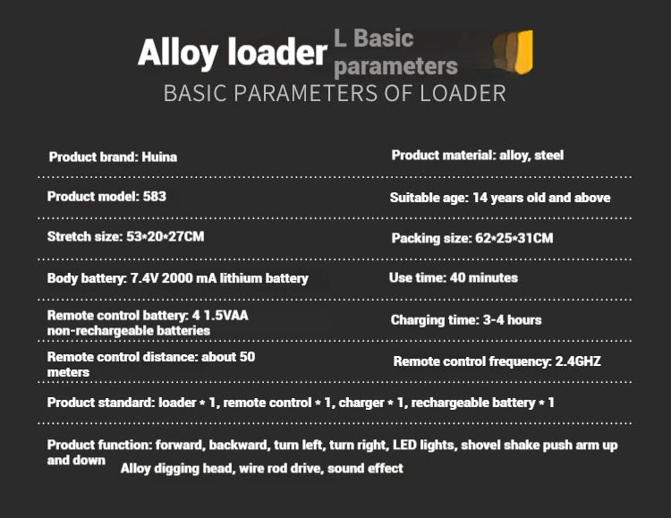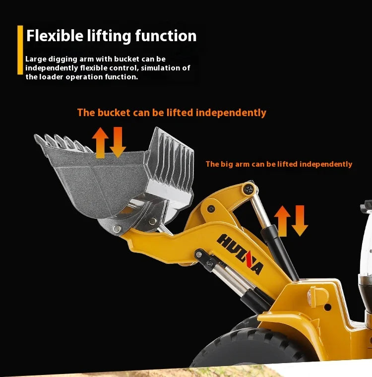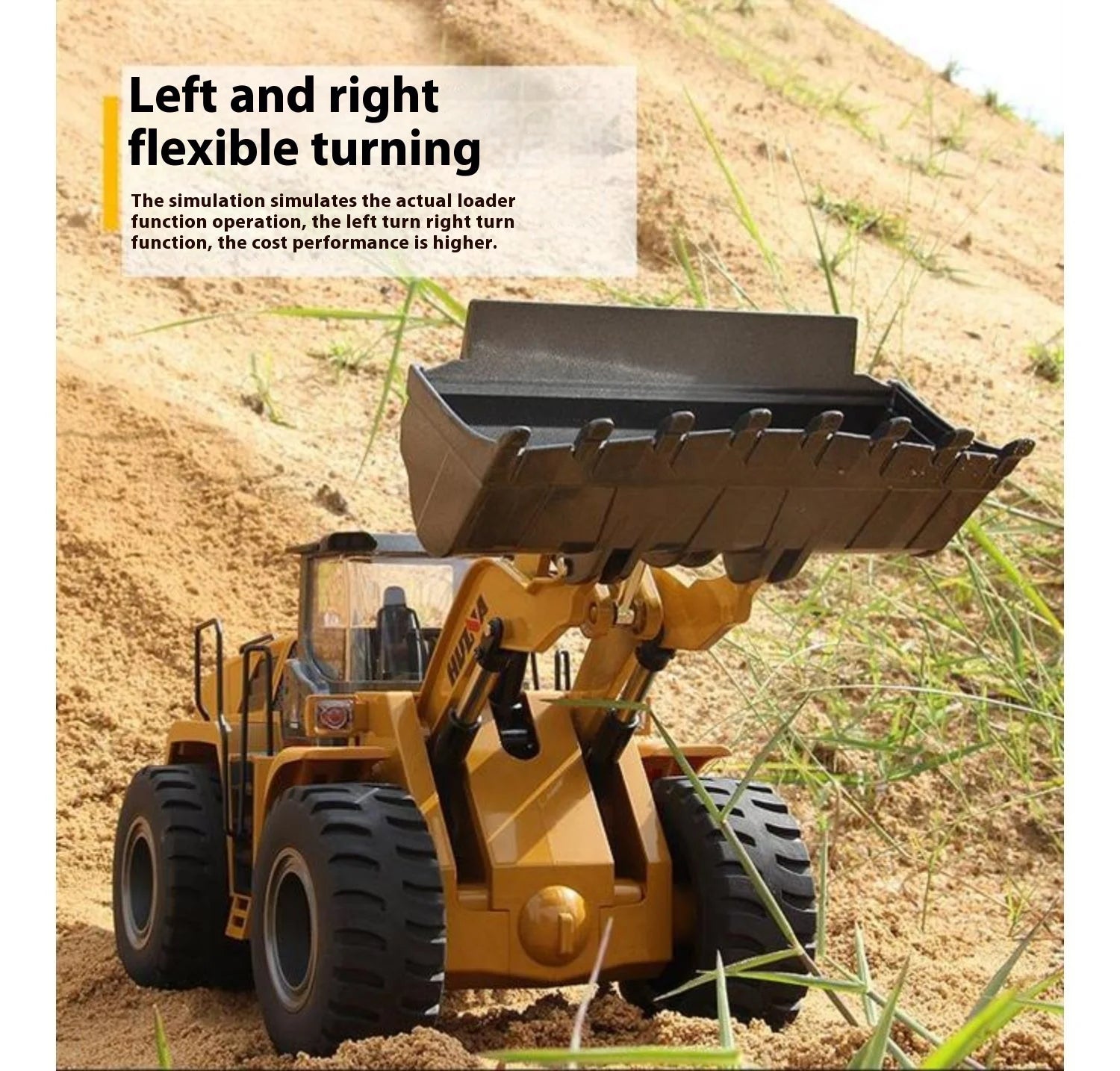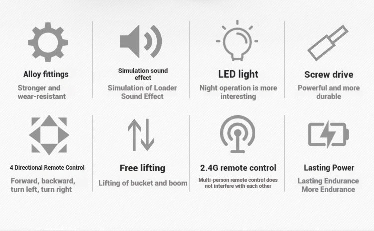 • Mouvements multiples : Avance, recul, virage à gauche et à droite, mouvements du bras et du seau, ainsi que la possibilité de commuter les effets sonores.