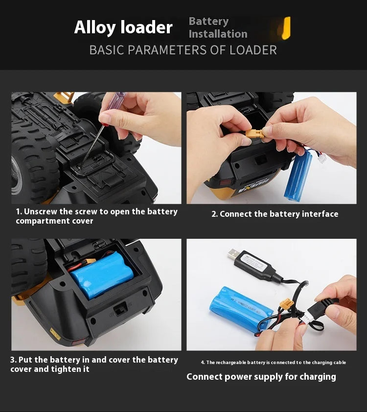 Utilisation et installation : Le Bulldozer est conçu pour une utilisation immédiate. Chargez la batterie au lithium, insérez les 3 piles AA (non fournies pour la télécommande) et suivez le manuel pour un assemblage rapide. La télécommande permet une prise en main aisée, pour des heures de pilotage sécurisé en extérieur, grâce à sa portée de 50 m et son temps de contrôle de 45 minutes.