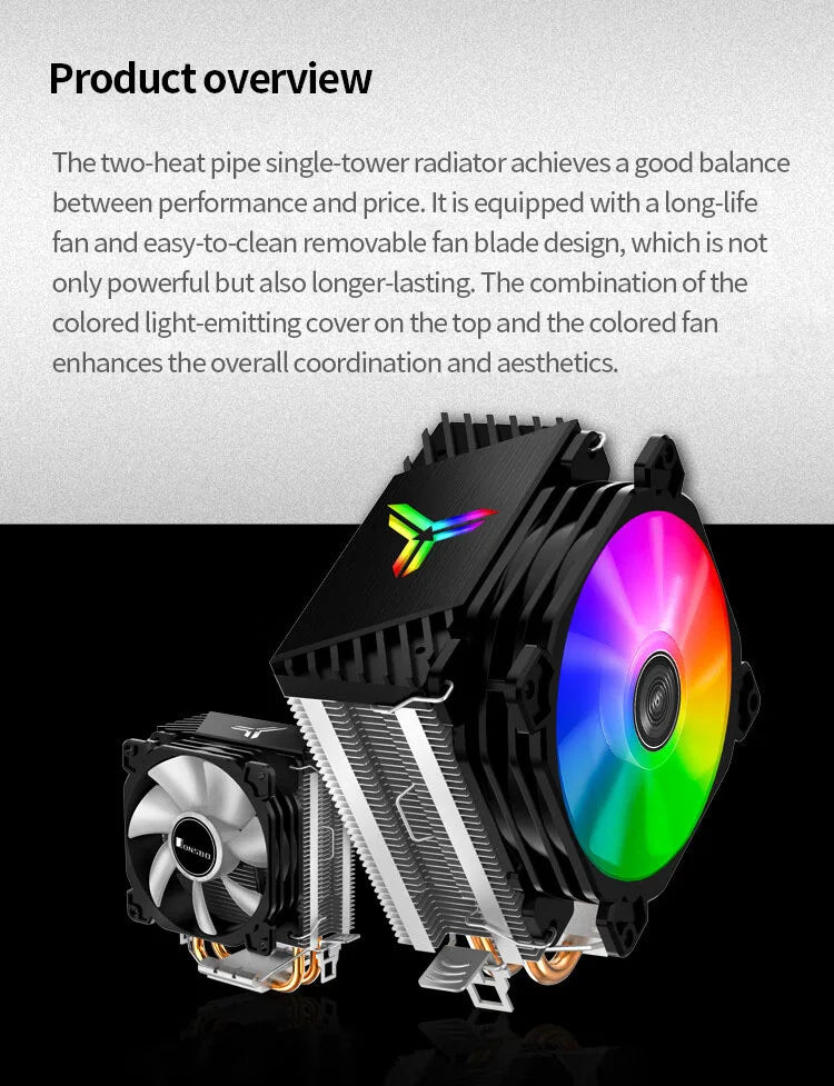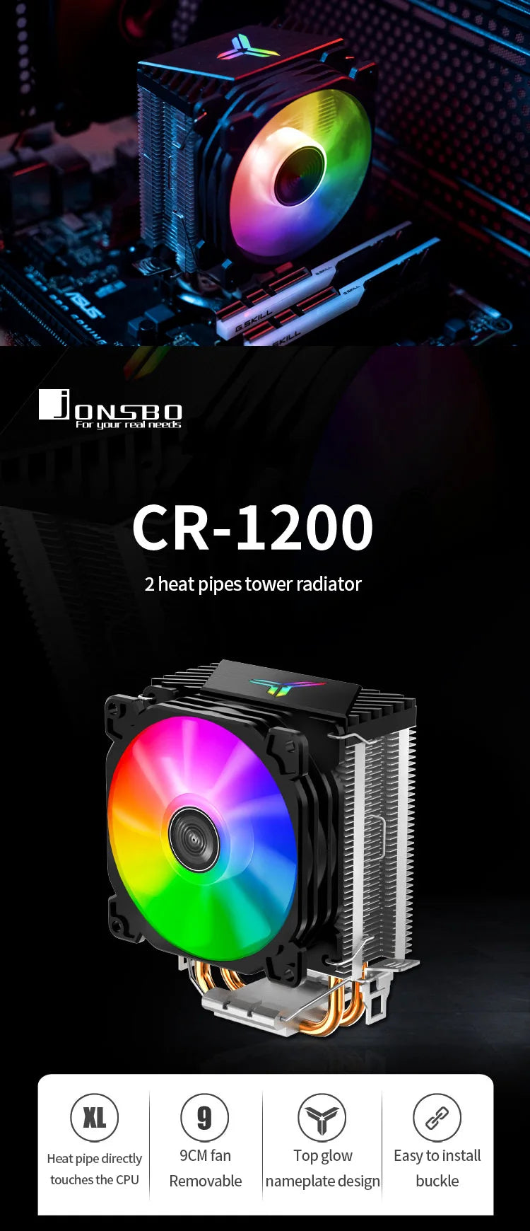 Découvrez le refroidisseur hautes performances Jonsbo CR1200, une solution innovante qui allie technologie de pointe et design captivant pour optimiser le refroidissement de votre processeur. Conçu pour répondre aux exigences des utilisateurs les plus exigeants, ce refroidisseur à tour offre un équilibre parfait entre performance et esthétique grâce à son éclairage RVB et ses deux caloducs en cuivre pur.