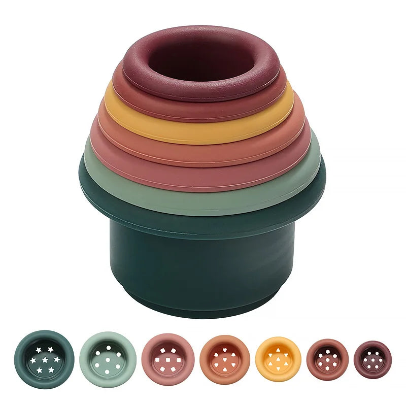 Cet ensemble de 7 jouets en silicone pour bébé comprend des blocs de construction, des gobelets empilables et des sabliers ludiques, parfaits pour stimuler le développement des compétences motrices et la coordination. Fabriqués en silicone souple et sûr, ces jouets sont conçus pour résister aux manipulations des tout-petits tout en étant faciles à nettoyer.