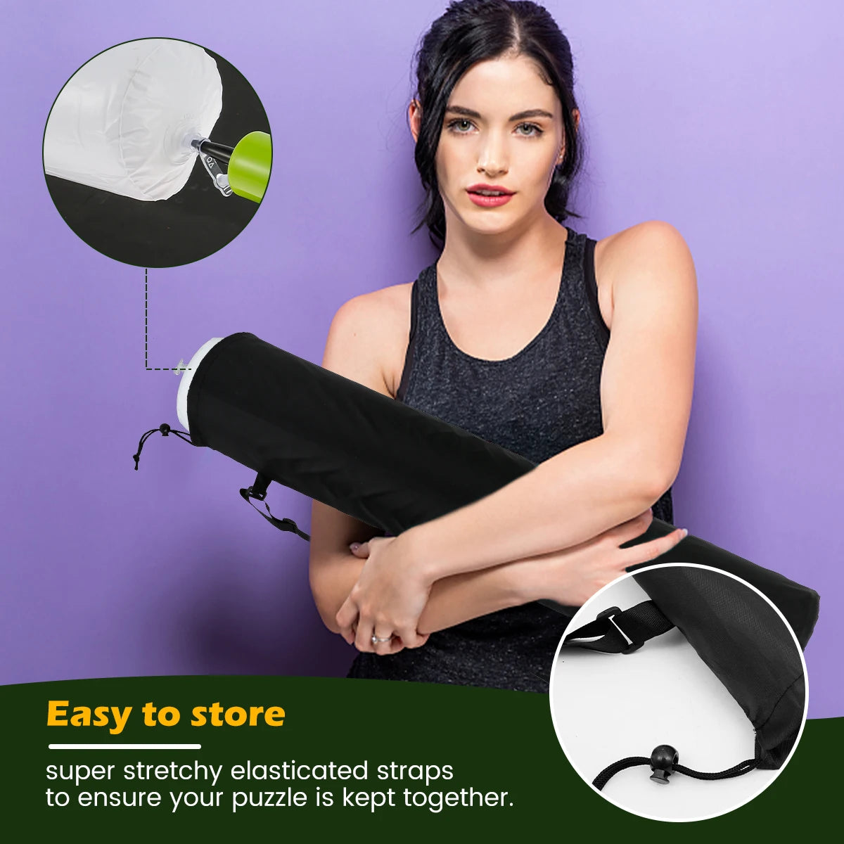 • Rangement optimisé : Enroulez le tapis grâce aux tubes de gonflage et fixez-le solidement dans le sac de rangement avec un élastique.