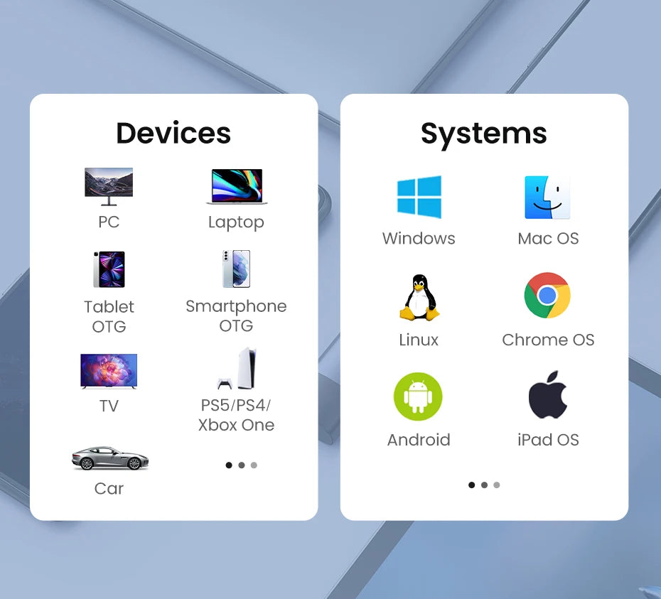 Ce lecteur se branche directement en mode plug & play sur votre ordinateur, tablette ou smartphone compatible OTG. Il suffit d’insérer vos cartes SD ou Micro SD dans les fentes dédiées pour bénéficier immédiatement d’une lecture et écriture simultanées, simplifiant ainsi l’accès à vos fichiers et photos à tout moment.