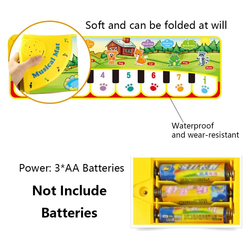 Utilisation et instructions : Installez le tapis sur une surface plane et insérez 3 piles AA pour le mettre en marche. Les enfants peuvent marcher ou toucher le tapis pour déclencher des mélodies et rythmes variés, composant ainsi leur propre symphonie. Veillez à utiliser le tapis dans un environnement à température modérée et à retirer les piles lors d’une longue période d’inactivité.