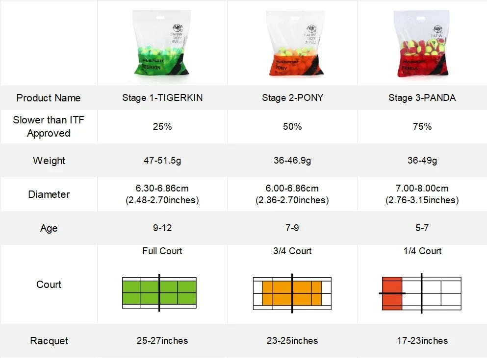 • Pour Stage 1 TIGERKIN, utilisez des raquettes de 25" à 27" pour bénéficier d’un jeu fluide sur un terrain complet