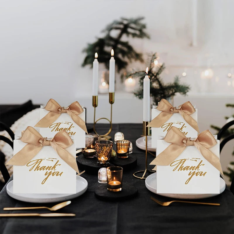 Ajoutez une touche raffinée à vos événements spéciaux avec notre boîte à bonbons "Merci" ornée d'un ruban délicat. Parfaite pour Noël, mariages, baby showers ou anniversaires.