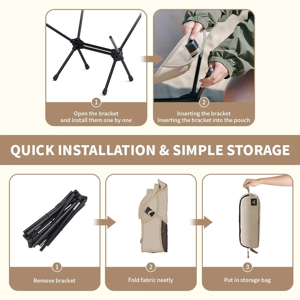 Rangement : Après utilisation, repliez la chaise et rangez-la dans le sac de transport pour un rangement compact et un transport facile.
