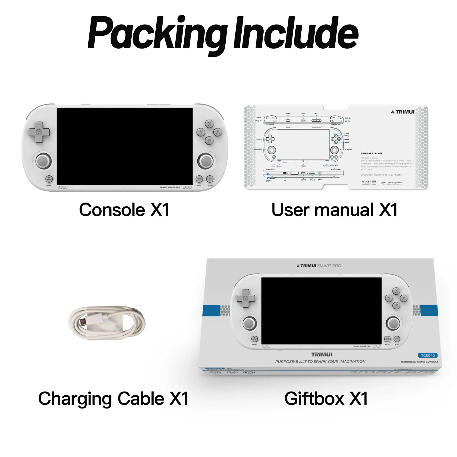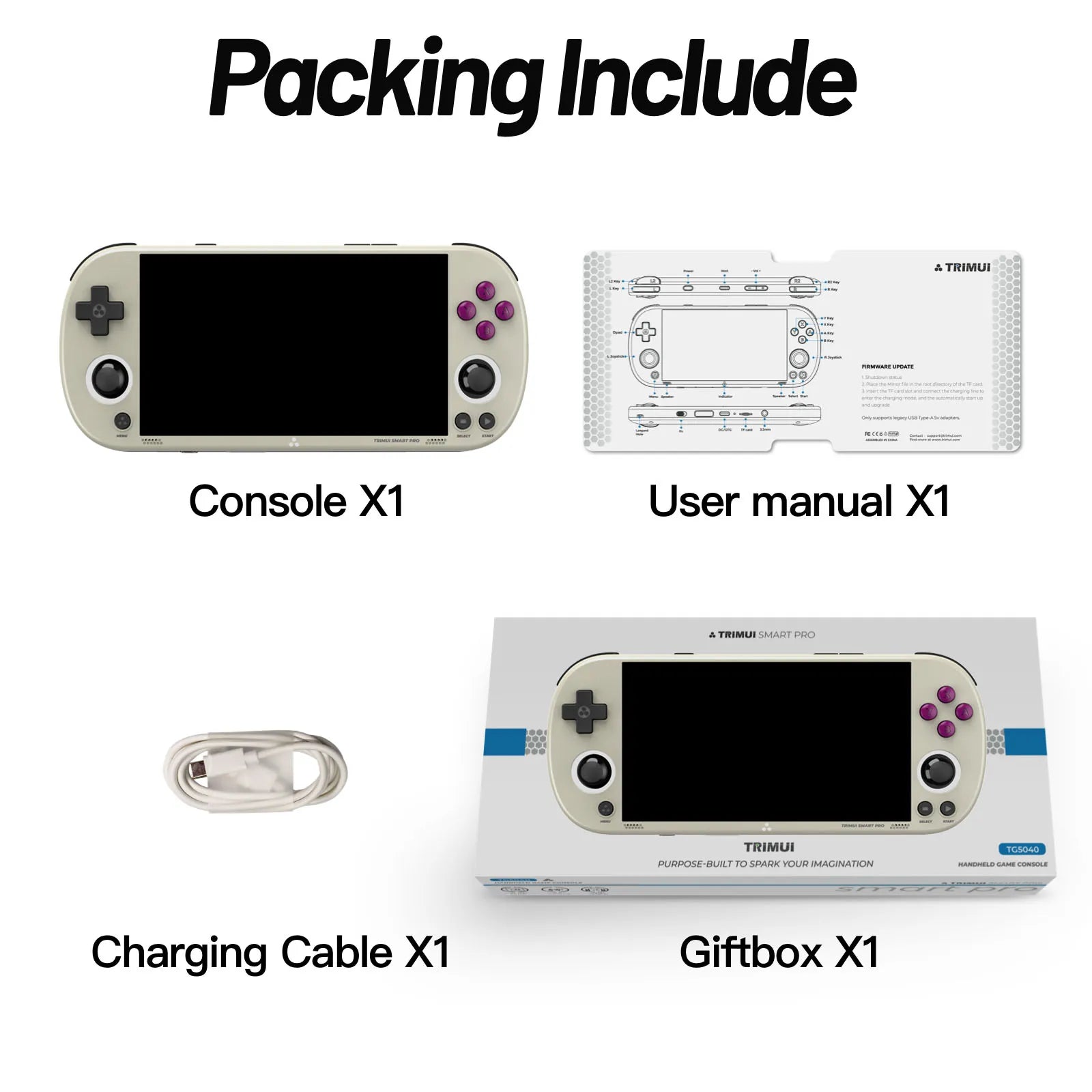 Package inclus : Console Trimui Smart Pro, câble de chargement Type-C, manuel d'utilisation