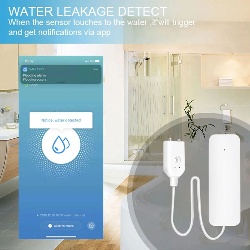 Utilisation polyvalente : Ce capteur peut être installé dans diverses zones de la maison : cuisines, salles de bains, aquariums, ou pour surveiller les tuyaux d'eau ou les zones de jeux pour enfants.