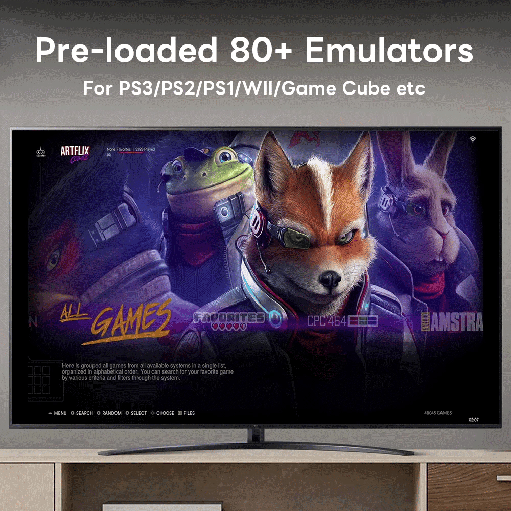 Jeux inclus : 52 000+ jeux couvrant des titres classiques et modernes de consoles comme PS3, PS2, WiiU, Wii, MAME, et SS