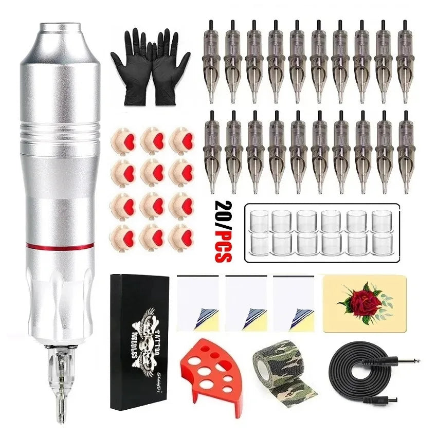 Ce kit est conçu spécialement pour les débutants souhaitant s’initier à l’art du tatouage avec du matériel fiable et facile à utiliser. Avec sa machine rotative style stylo, ses 20 aiguilles jetables et ses 7 encres variées, il offre tout le nécessaire pour commencer immédiatement avec confiance et précision.