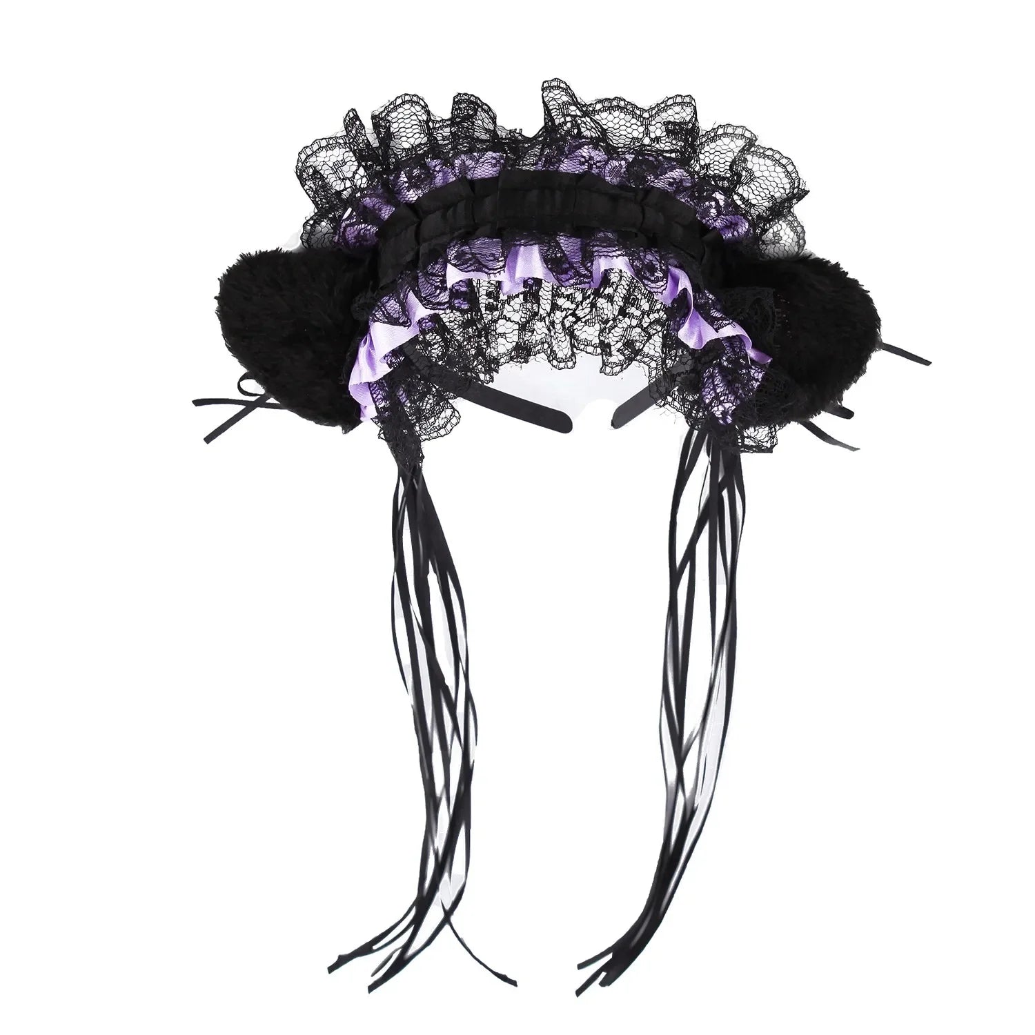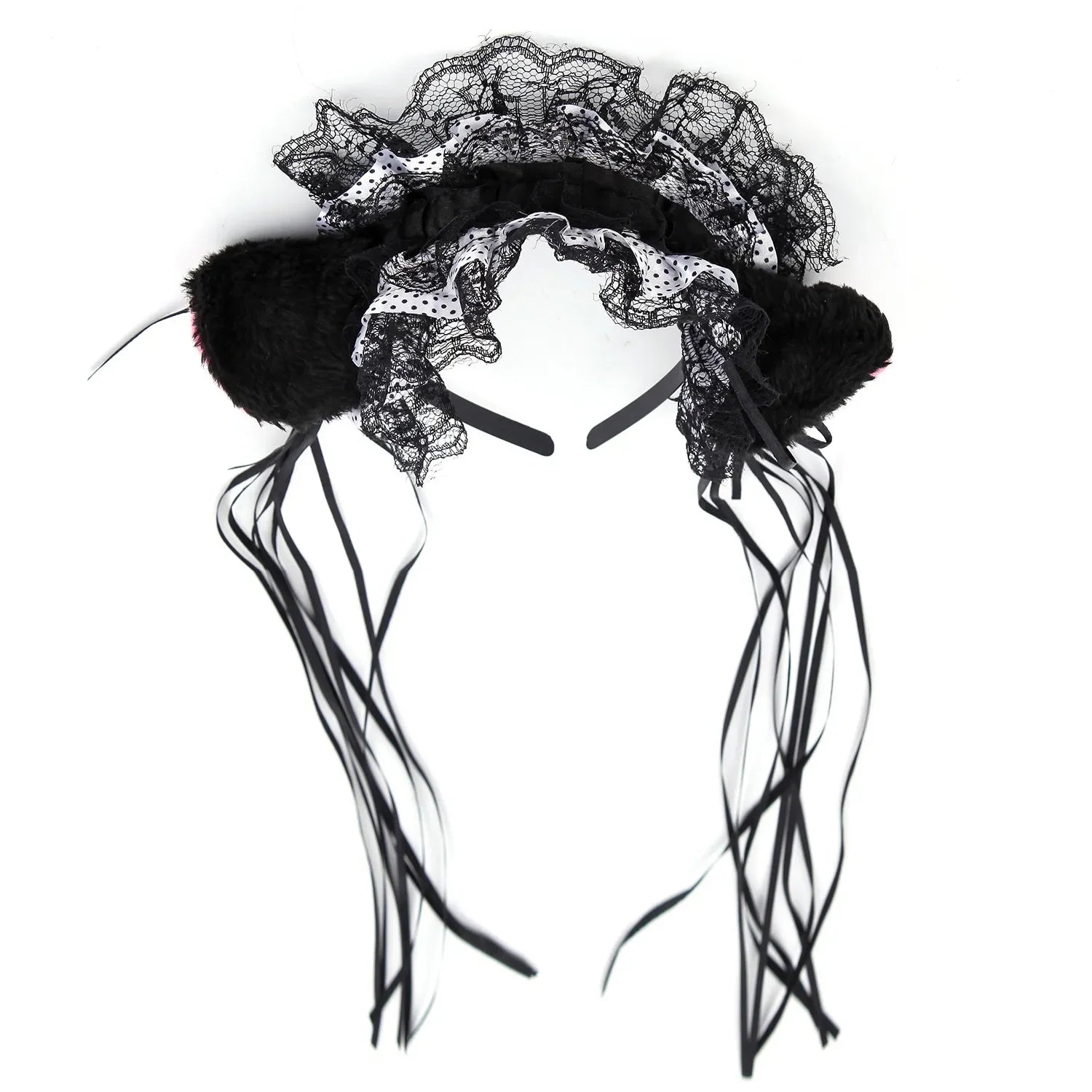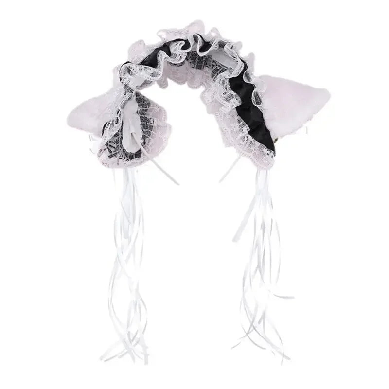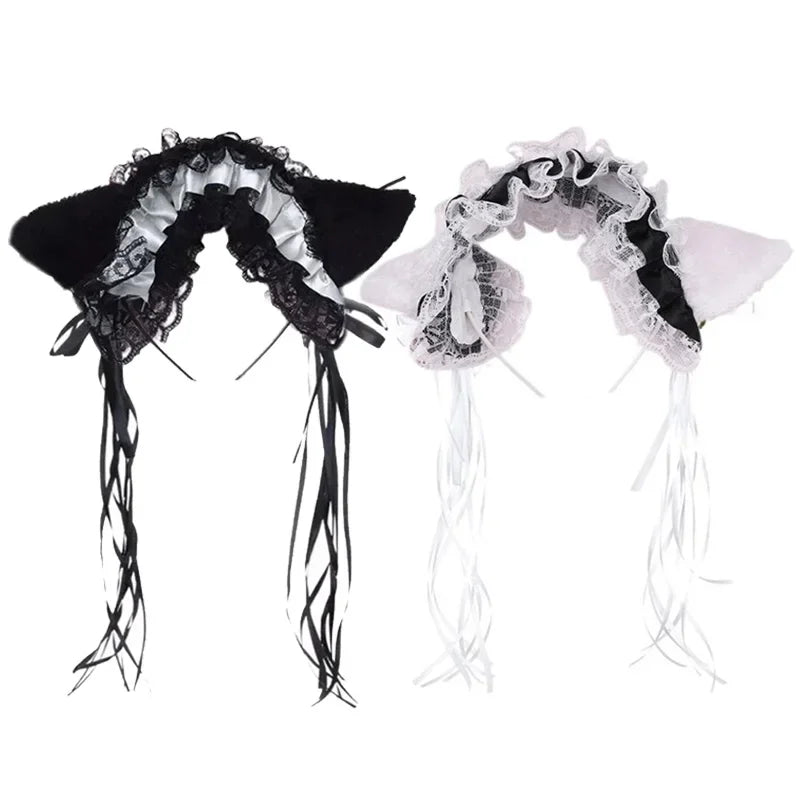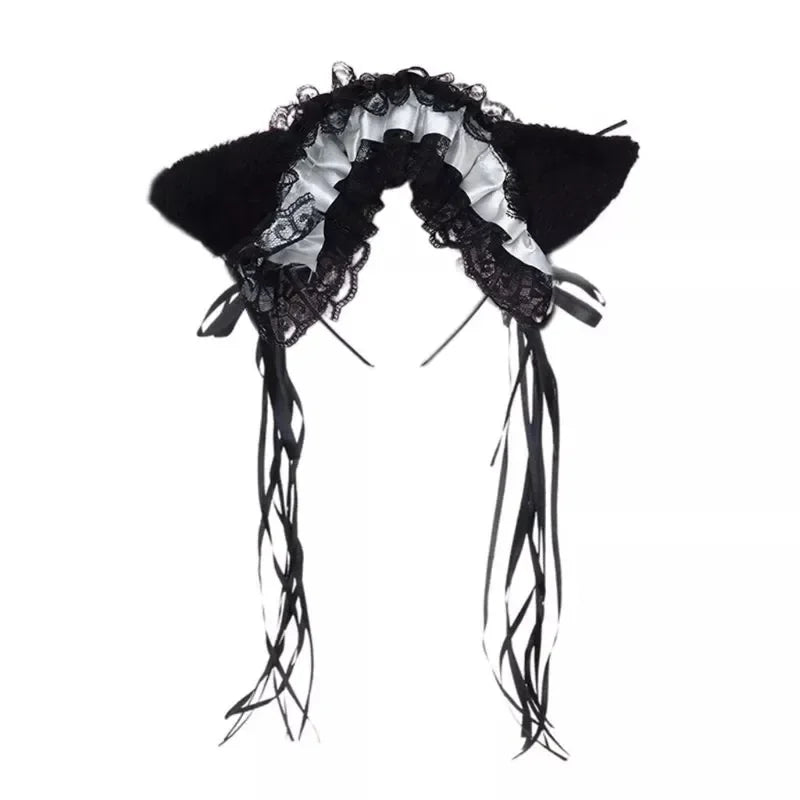 Bandeau Gothique Lolita Maid - Dentelle Volantée, Oreilles de Chat Peluche, Noeud Ruban, Clochette