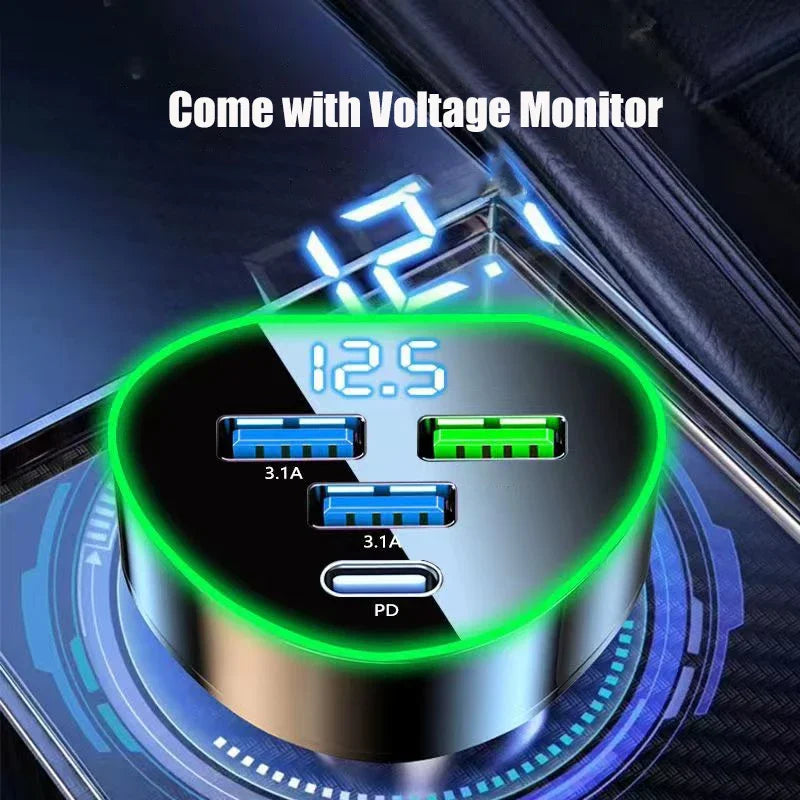 Chargeur Voiture USB Type-C Super Charge Rapide avec Moniteur de Tension LED