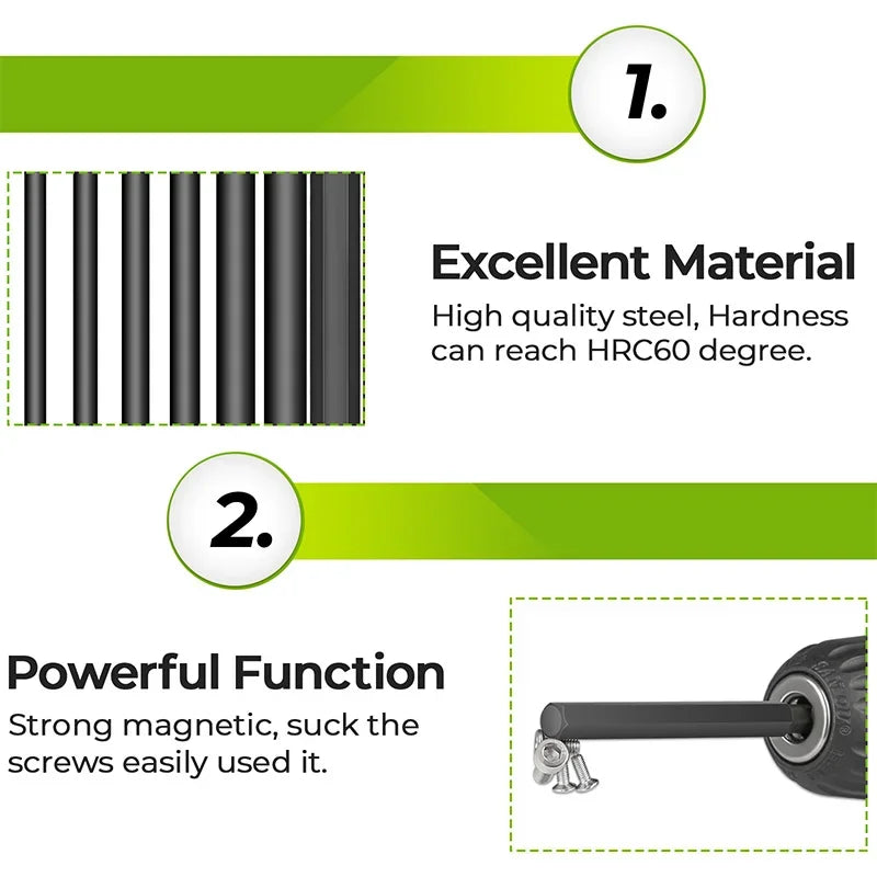 - Sécurité et Confort : Les embouts magnétiques vous permettent de travailler avec une prise ferme et sûre, réduisant ainsi le risque de blessures et augmentant le confort d'utilisation.