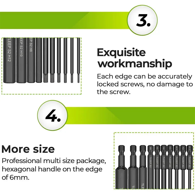 - Conception Hexagonale Précise : Chaque embout est conçu pour une adhérence optimale, ce qui permet un vissage plus rapide et précis, réduisant les risques de glissement ou de dommage.