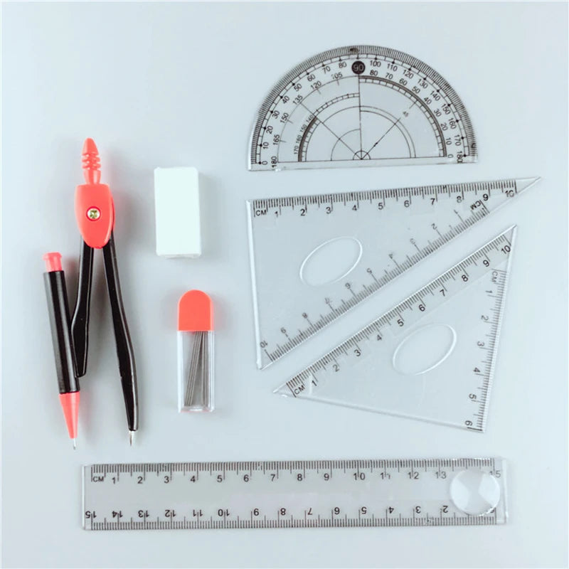 - Produit : Ensemble Géométrie Scolaire 7 Pièces (Compas, Équerre, Règle, Gomme)