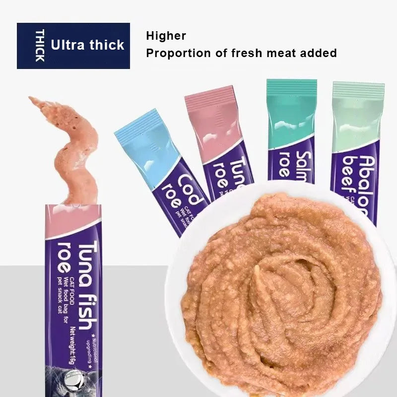 - Description : Friandises liquides au goût de thon et de caviar, formule mixte, 16g par bande