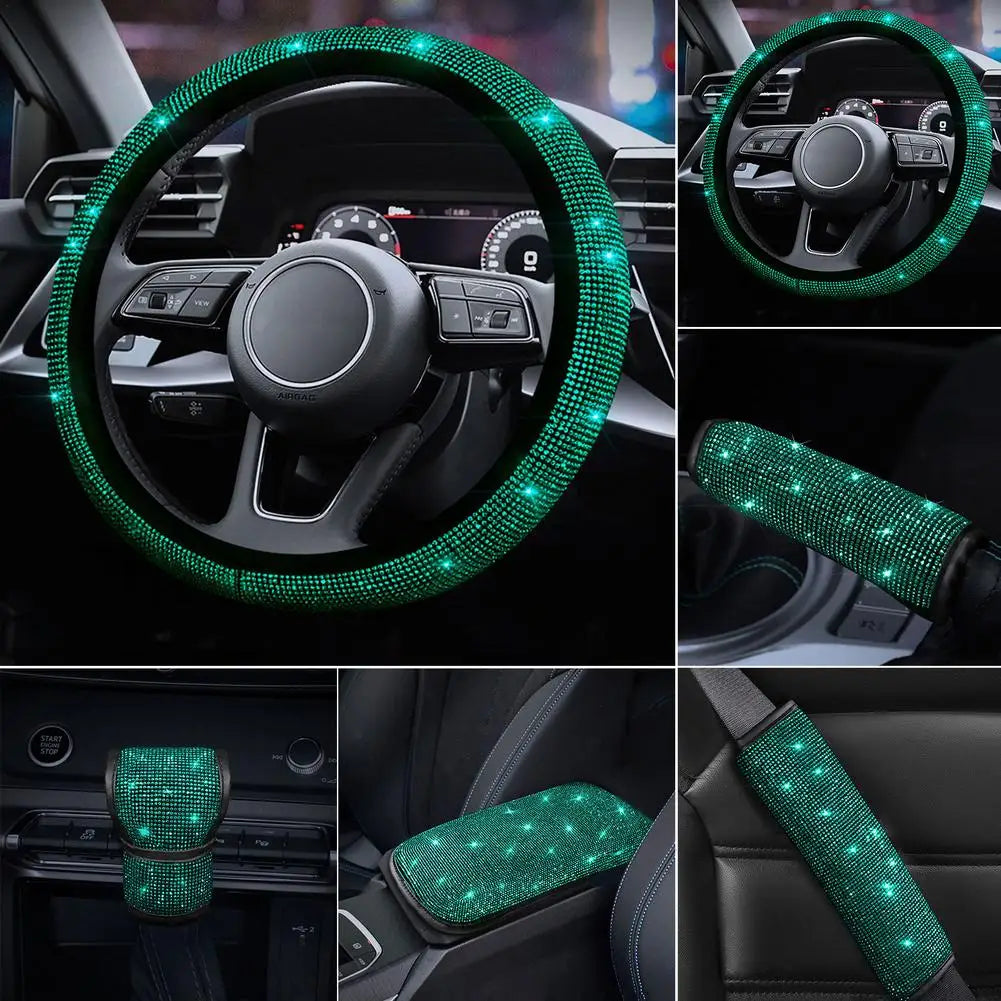 Élevez le confort et le style de votre voiture avec la Housse de Volant Bling Émeraude pour Voiture. Ce kit complet comprend des couvertures assorties pour le frein à main, l'accoudoir et le levier de vitesses, transformant votre intérieur en un espace luxueux et confortable.