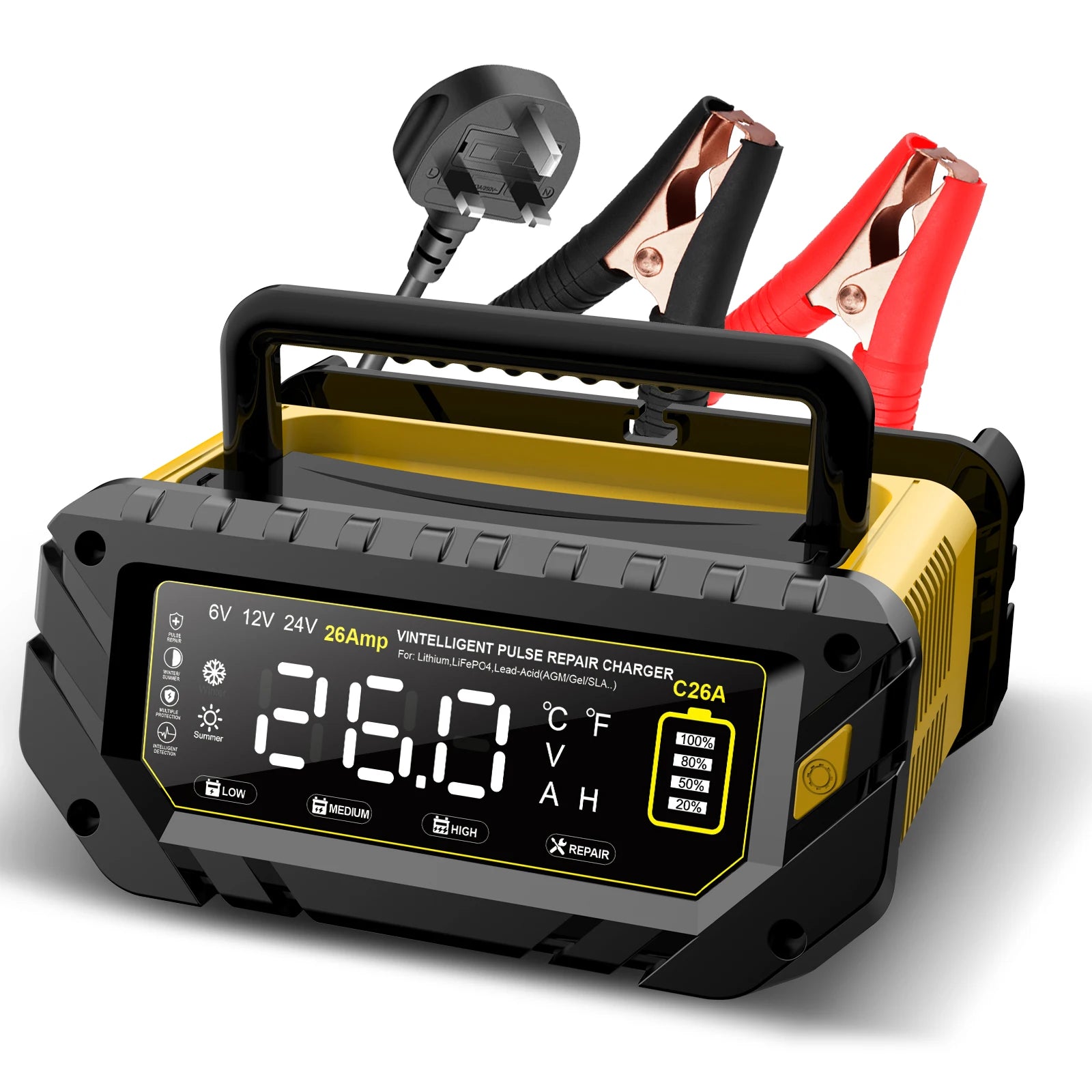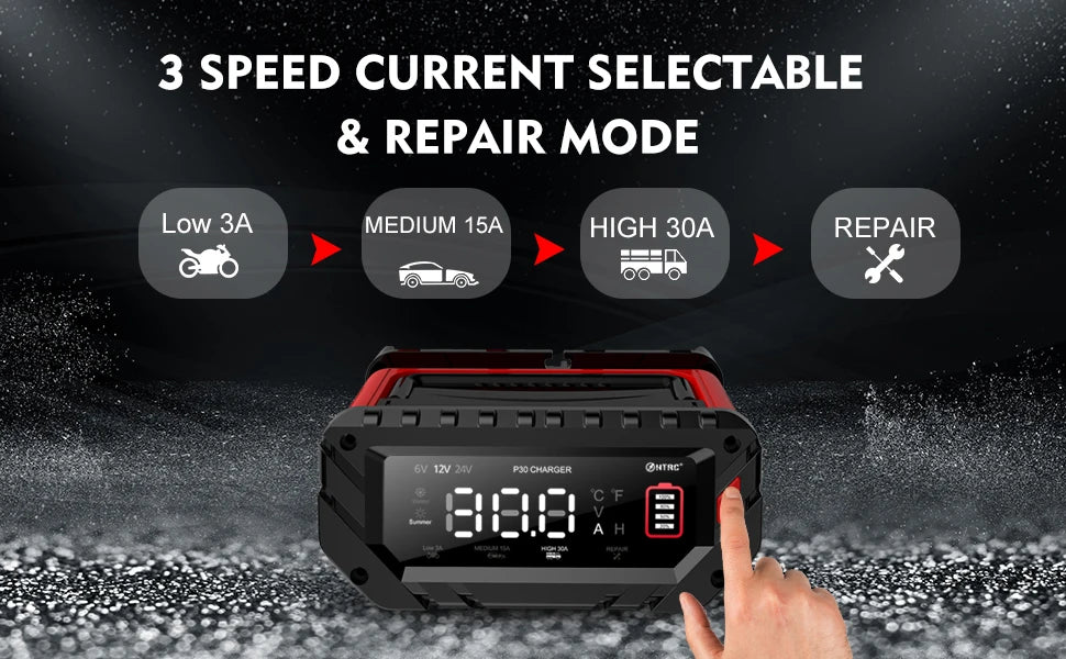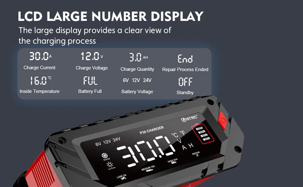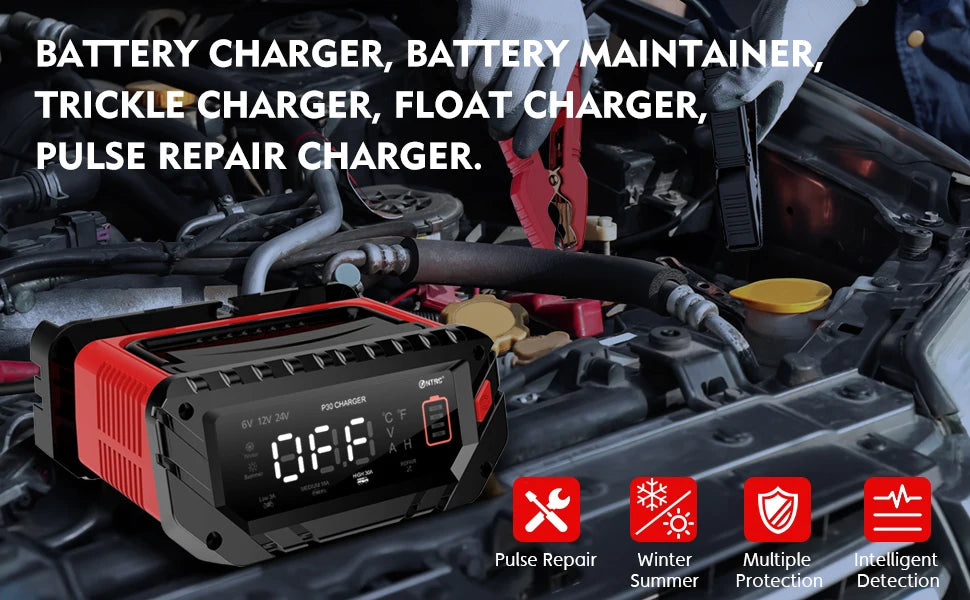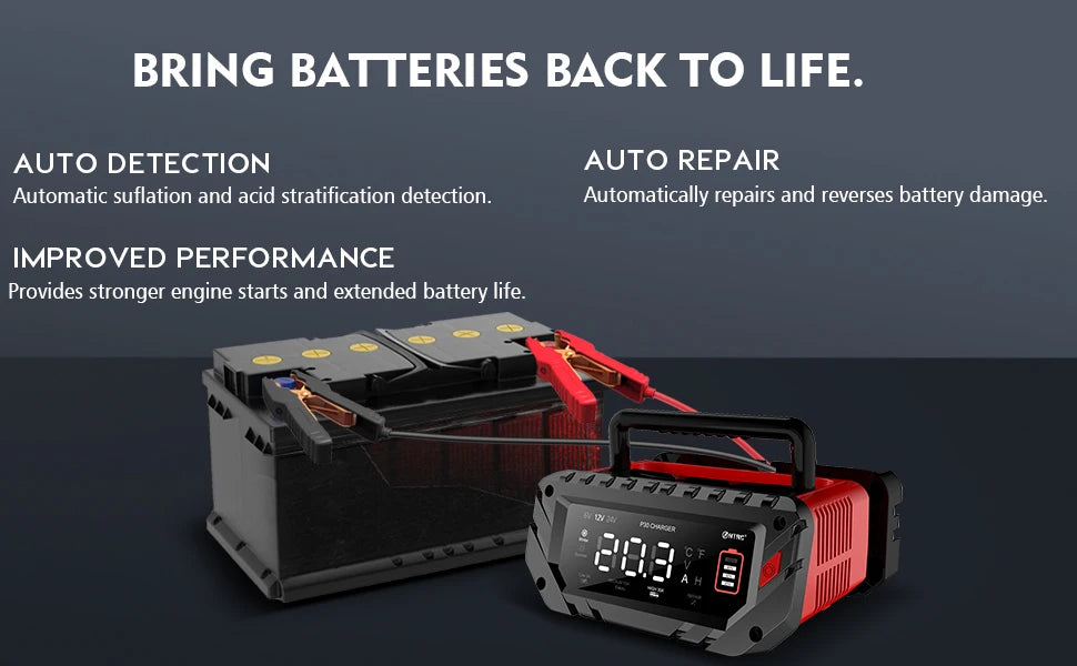 • Adapté aux batteries plomb-acide, SLA, Gel, Lithium, LiFePO4 (y compris AGM, WET, EFB, etc.)