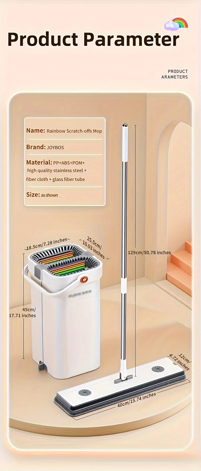 • Matériaux premium : chiffon de vadrouille en velours corail, planche et baril en matériau PP, grattoir en EVA et tige de sentier en acier inoxydable.