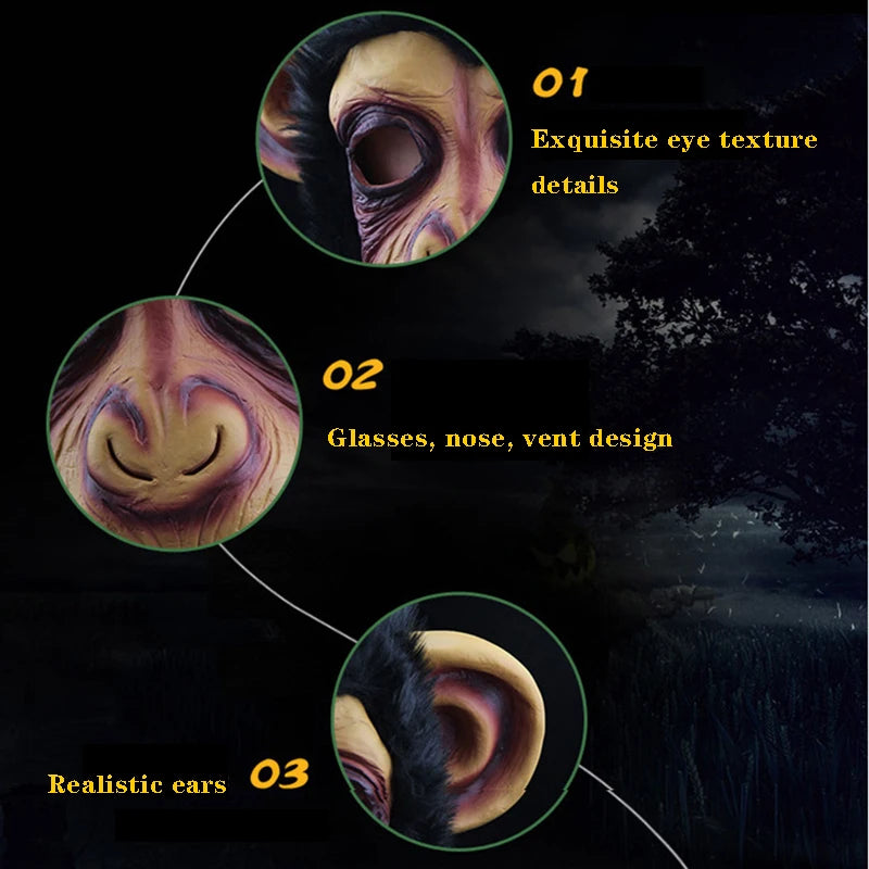 - Design : Masque 3D couvrant entièrement le visage avec une texture détaillée d'orang-outan et de chimpanzé