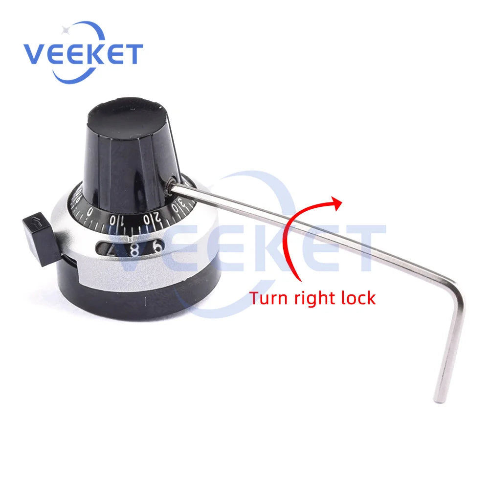 Montez le bouton sur l’arbre de sortie du potentiomètre multi-tours. Alignez la graduation « 0 » avec la position de départ, puis fixez fermement avec les vis latérales. Tournez pour ajuster la valeur souhaitée tout en lisant la progression à l’aide de l’échelle gravée.