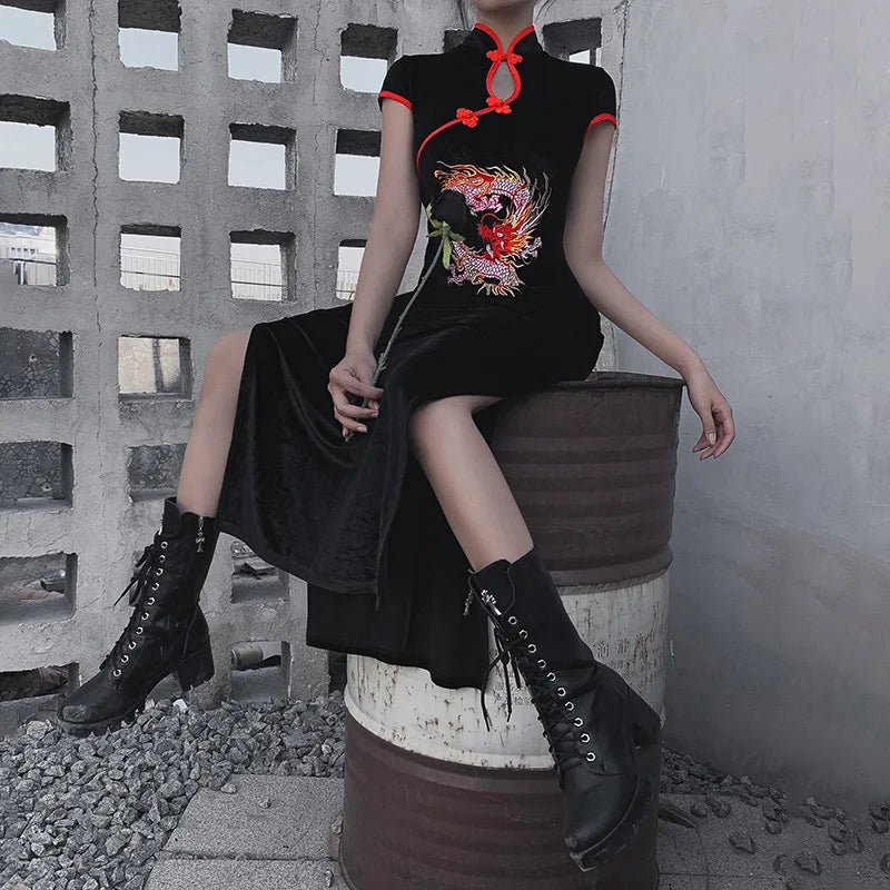 Plongez dans un univers où tradition et modernité se rencontrent avec cette robe gothique chinoise au design envoûtant. Son col montant raffiné et ses somptueuses broderies de dragons, symboles de force et de puissance, font de cette pièce un véritable chef-d'œuvre de l’élégance vintage.