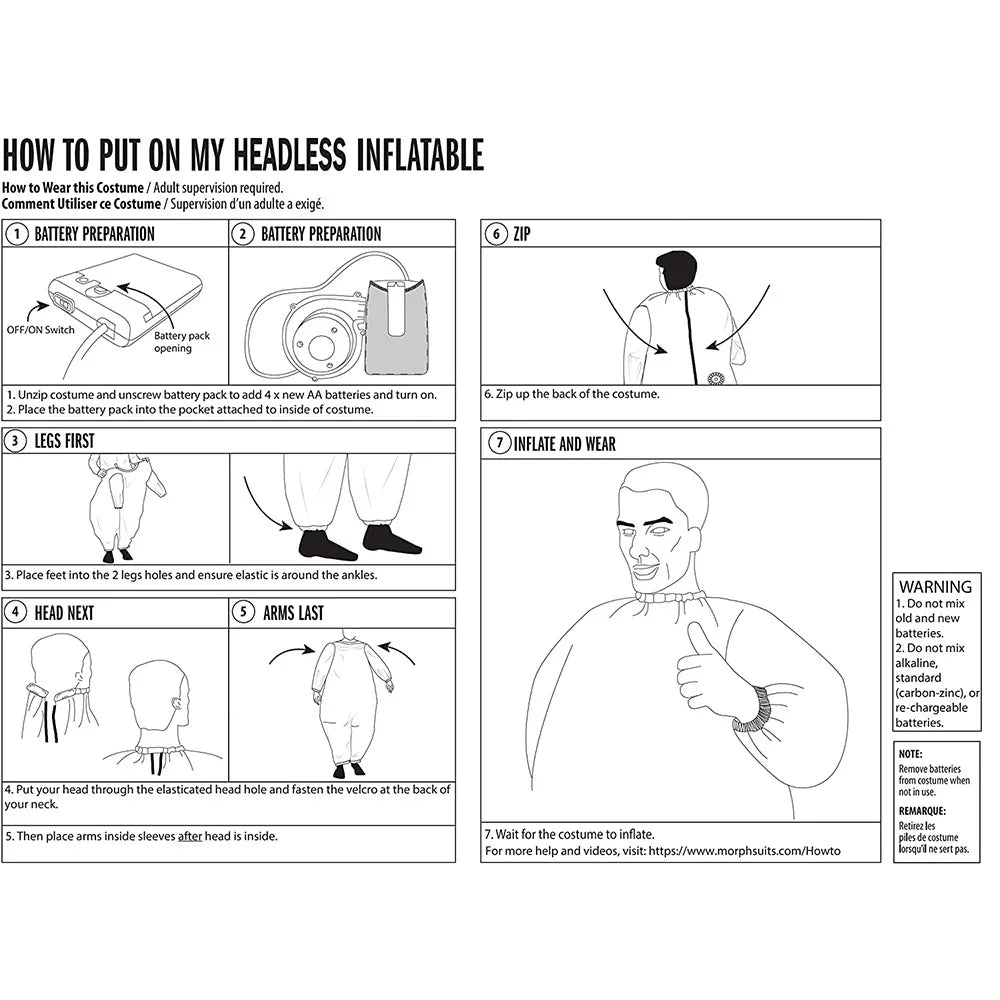 Après réception, il suffit d’insérer 4 piles AA dans le boîtier de batterie. Portez le costume normalement, puis activez l’interrupteur pour démarrer le ventilateur. En seulement 20 secondes, le costume se gonfle entièrement et garde sa forme tant que le ventilateur fonctionne. Veuillez noter que, malgré la résistance du matériau, l’usage dans l’eau est à proscrire afin de préserver le bon fonctionnement du dispositif.