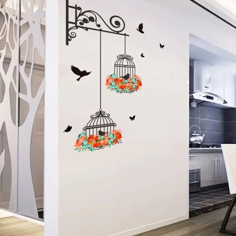 Autocollant Mural Créatif - Cage à Oiseaux et Fleurs Colorées