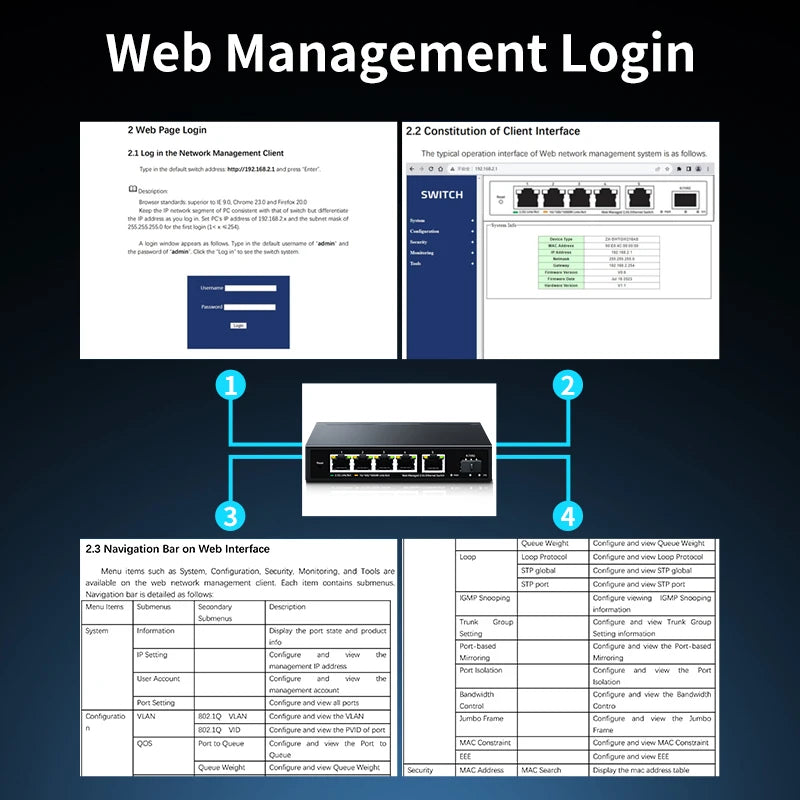 - Type de switch : Ethernet non géré avec options de gestion Web