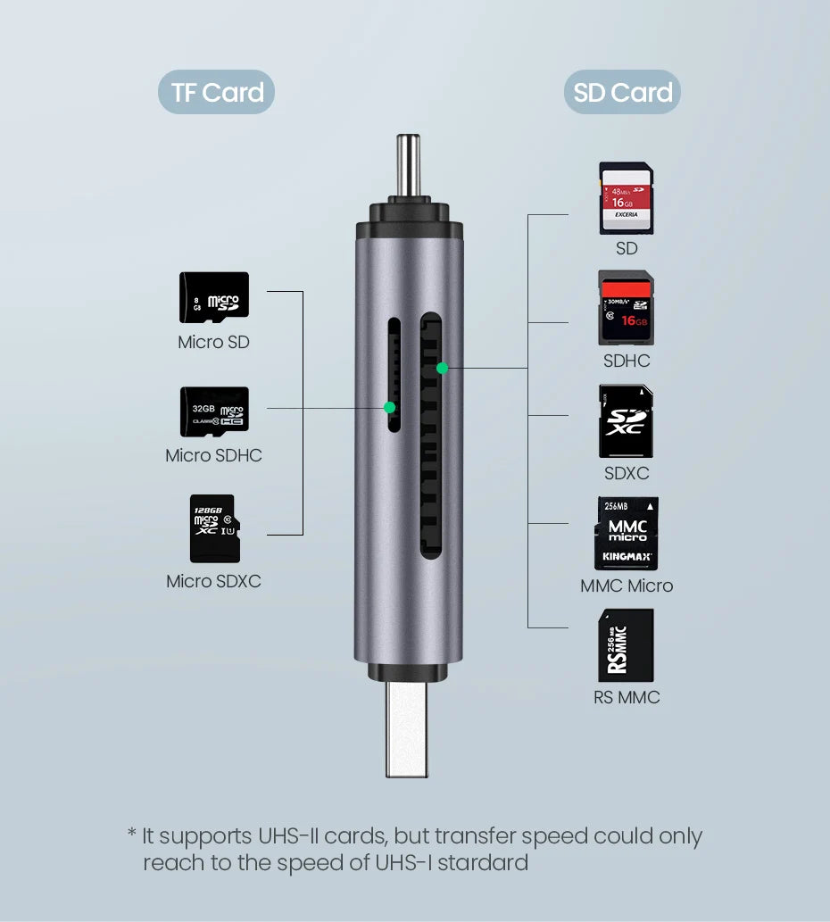 • Supporte la lecture et l’écriture simultanées de 2 cartes (SD, SDHC, SDXC, RS-MMC, MMC, Micro SD, Micro SDHC, Micro SDXC) avec une capacité maximale de 2TB.