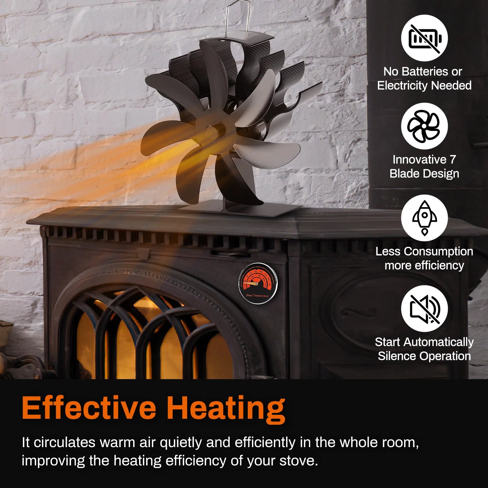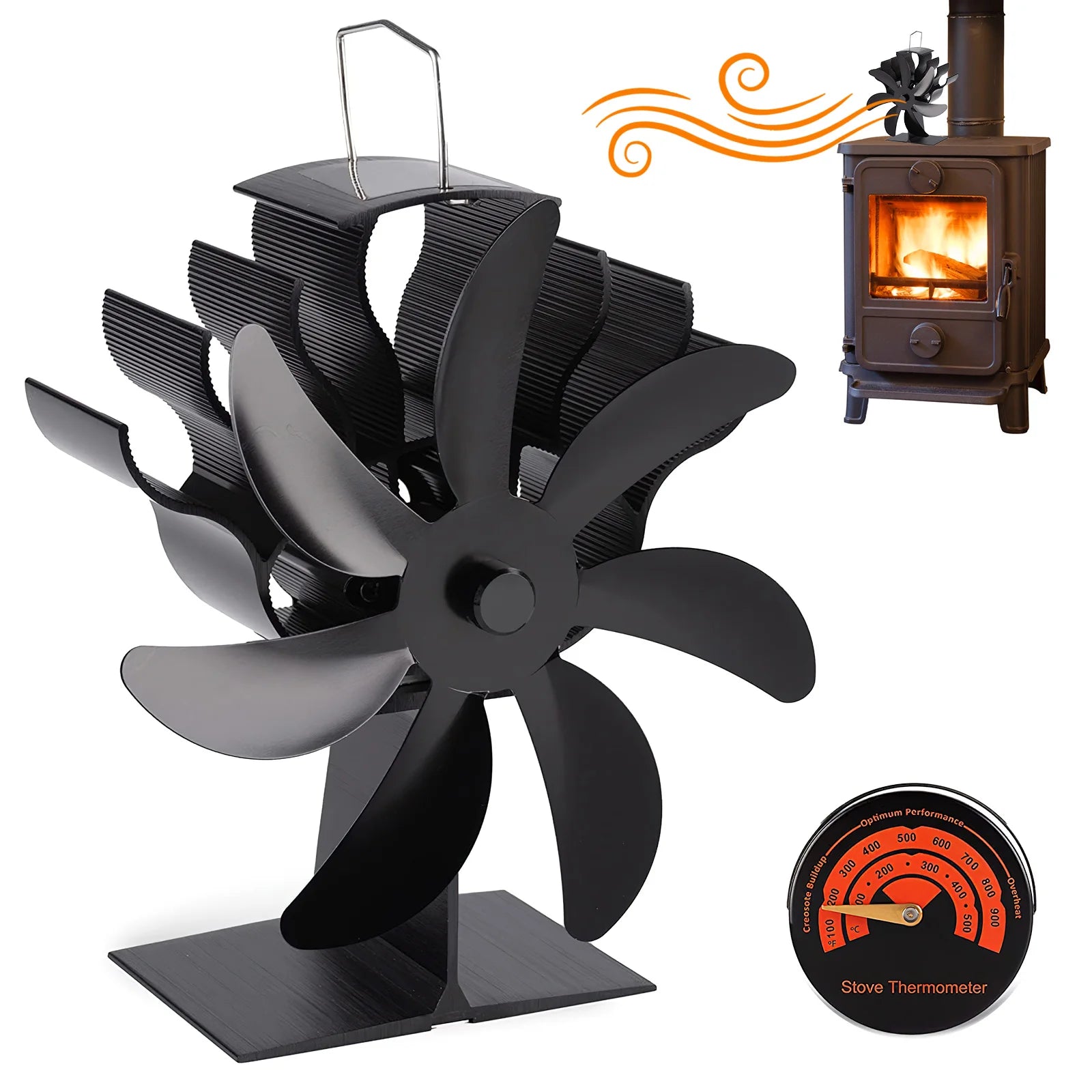 - Alimentation : Fonctionne uniquement avec la chaleur du poêle (aucune alimentation électrique requise)